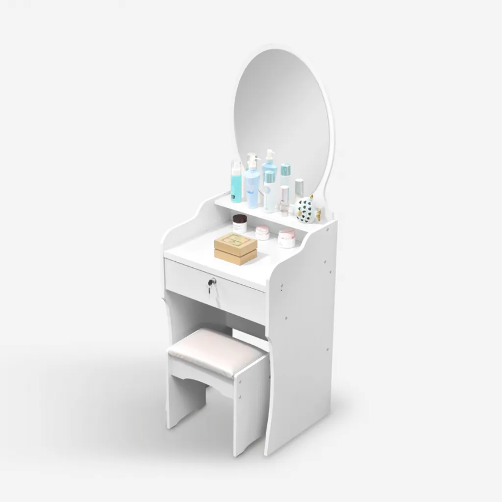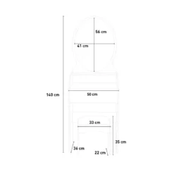 Katrina ist ein hübsches und schlichtes Möbelstück im weißen Farbton. Von LBB entworfen für Frauen, die nicht auf eine Kosmetikstation verzichten möchten, obwohl Ihnen nur wenig Platz in kleineren Räumen zur Verfügung steht. Dieser Kosmetiktisch ist kompakt und elegant. Er besteht aus einer Konsole und einer einzigen ausziehbaren Schublade, die es ermöglicht, Schmuck und Kosmetikprodukte stilvoll zu organisieren. Darüber hinaus verfügt er über eine doppellagige Arbeitsfläche, die ein schnelles und müheloses Verstauen von Kosmetika und Accessoires ermöglicht, ein ovales Spiegel, der dem gesamten Design ein modernes Facetten verleiht. Außerdem wird ein gepolsterter Hocker mitgeliefert, damit man bequem sitzend arbeiten kann. Der Rahmen des Stuhles besteht aus hochwertigem Holz- MDF, aber auch die polsterbaren Teile sind solid, langlebig und robust. Damit erfreut der Kosmetiktisch vor allem Personen, die wenig Raum haben aber modernes Design lieben.