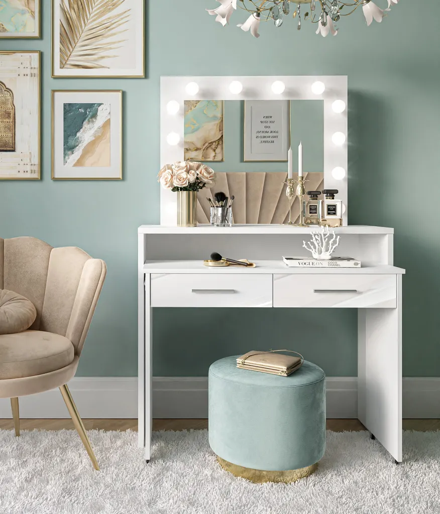 Neben seinen ästhetischen Qualitäten ist der Schminktisch auch sehr praktisch und nützlich. Er verfügt über einen großen Spiegel und 12 warme LED-Lampen – perfekt für den professionellen Make-up-Auftrag.
