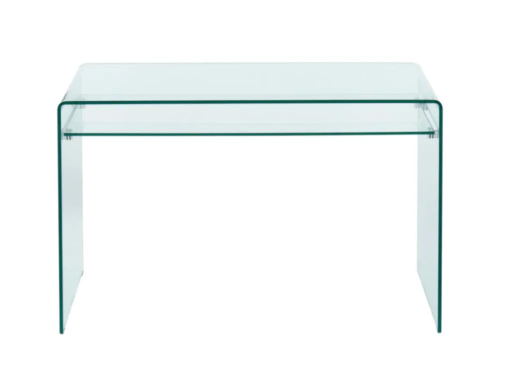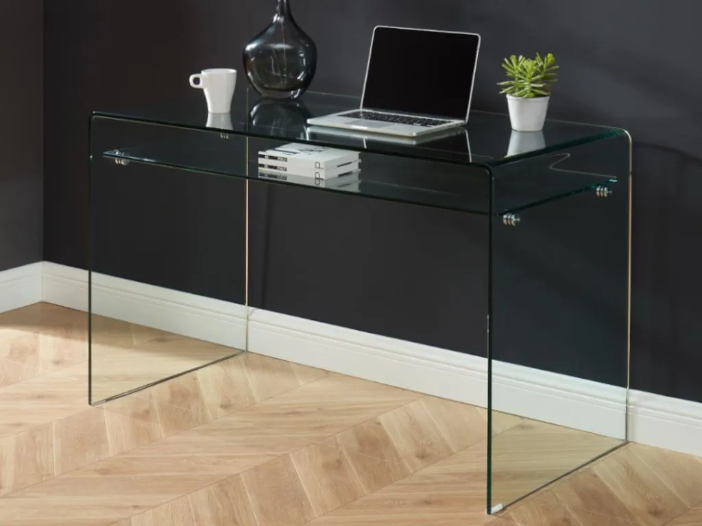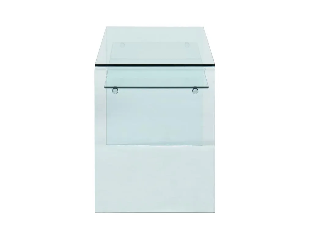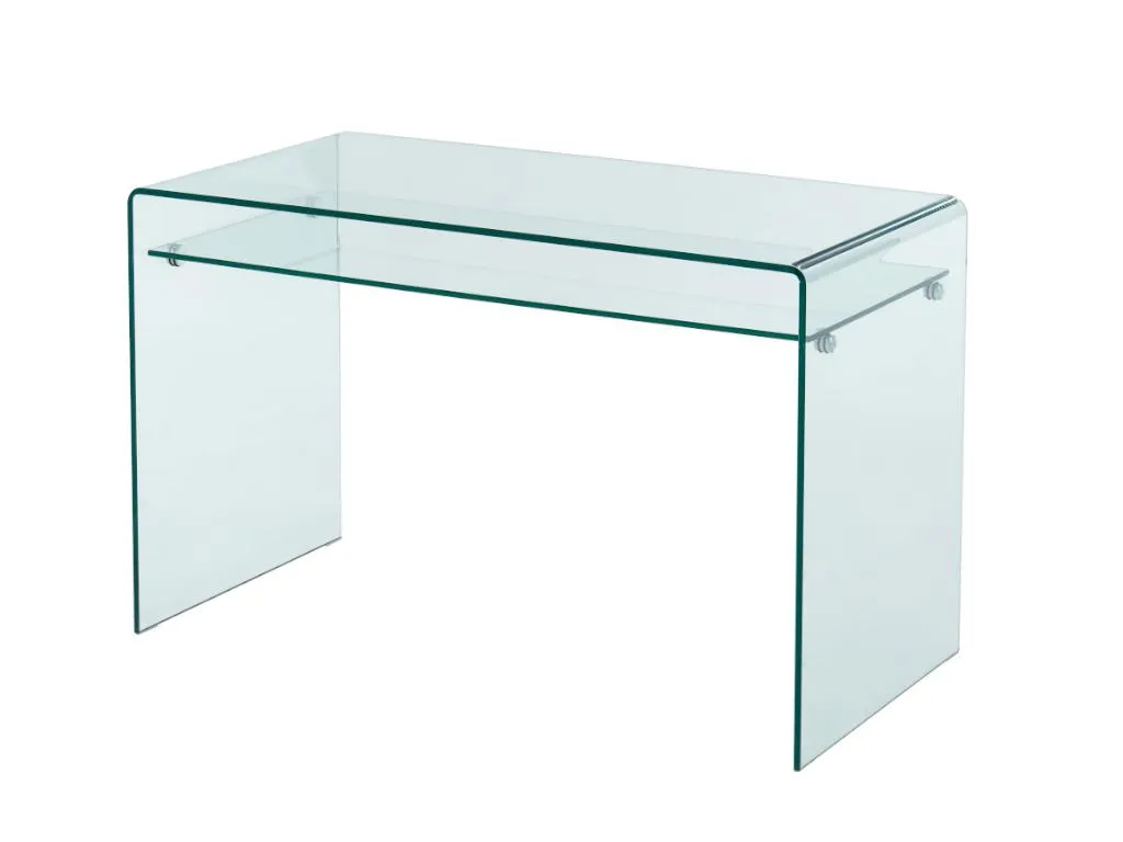 Die Möbel der Kollektion STILEOS zeichnen sich durch moderne und elegante Linien aus. Diese Möbelstücke sind aus 12 mm starkem, gebogenem Sicherheitsglas gefertigt. Sie sind robust und langlebig und verleihen Ihrem Interieur eine klare und leuchtende Note. Das Ablagefach des Schreibtischs bietet zusätzlichen Stauraum.