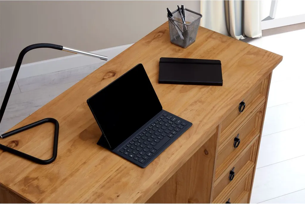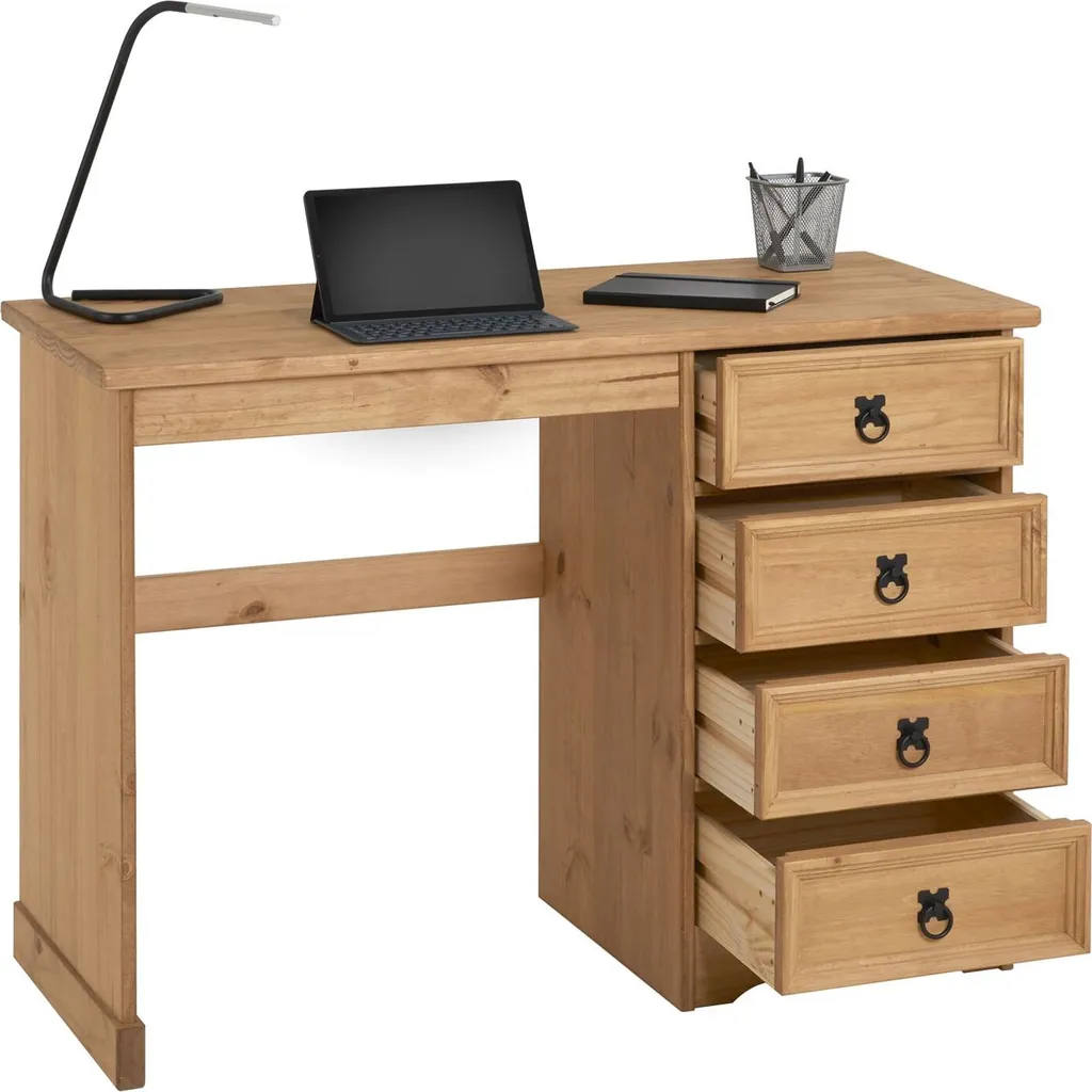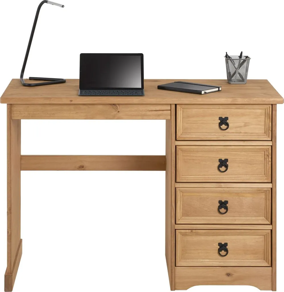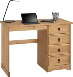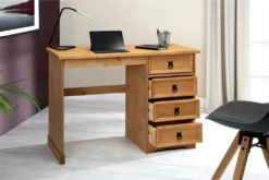 ist ein praktisches Möbelstück im zeitlosen Mexiko Stil das in vielen Wohnräumen Verwendung findet. In den 4 Schubladen findet sich ausreichend Platz für Büroartikel und wichtige Unterlagen. Die Arbeitsfläche bietet Ihnen ebenfalls ausreichend Raum zum Arbeiten. Das massive Kiefernholz sorgt für eine angenehme Haptik und lässt sich gut in jeden Wohnbereich integrieren. Die Beschläge aus Metall unterstreichen den Landhaus Stil optimal