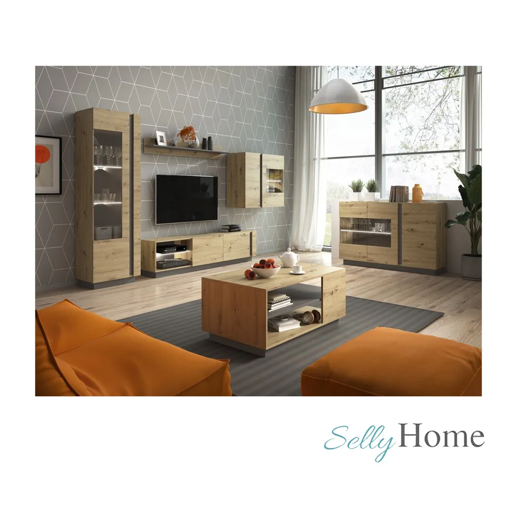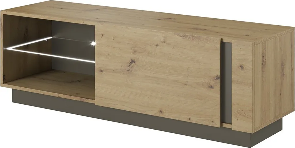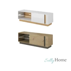 Stil – dank des skandinavischen Stils wirkt der Schrank ästhetisch und modern – der Glanz der weißen Fronten wird durch kontrastierende Eichenholzakzente gebrochen. Er eignet sich perfekt als TV-Möbel – im Inneren können Sie Medienartikel, Bücher oder Dinge des täglichen Bedarfs unterbringen.