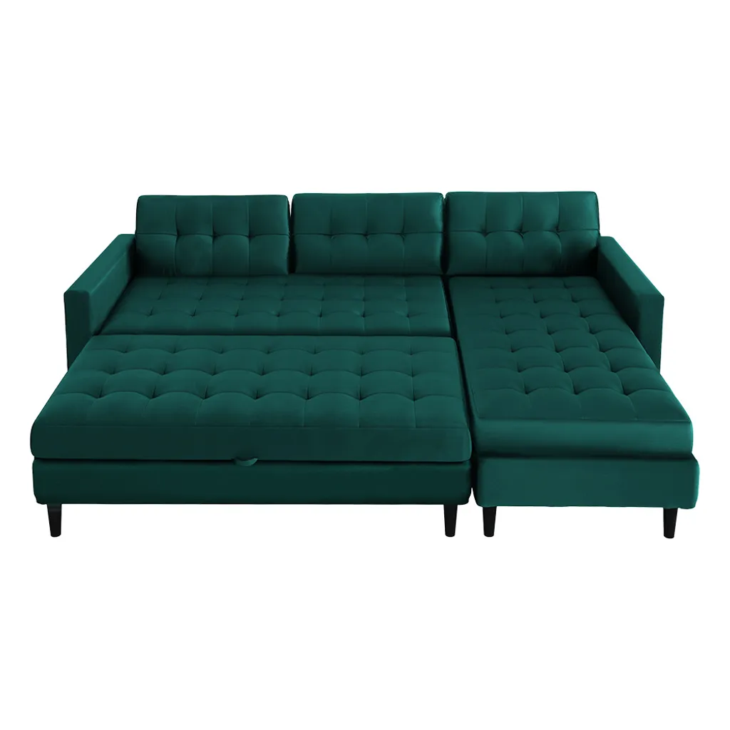 Das Schlafsofa KOPENHAGA verbindet geschickt Funktionalität, Eleganz und hochwertige Verarbeitung. Mit seinem minimalistischen Design, der einfachen geometrischen Steppung und klassischen Knopfheftung kommt das Sofa schlicht und modern daher. Die schlanken, konisch zulaufenden Holzfüße sorgen für visuelle Leichtigkeit. Die Ottomane ist beidseitig montierbar, Sie entscheiden, ob Sie die Ottomane links oder rechts haben möchten. Auf diese Weise lässt sich das Sofa optimal in die vorhandene Zimmereinrichtung integrieren. Da der Rücken echt bezogen ist, kann das Sofa nicht nur an der Wand stehen, sondern auch als ein stilvoller Raumteiler dienen.
