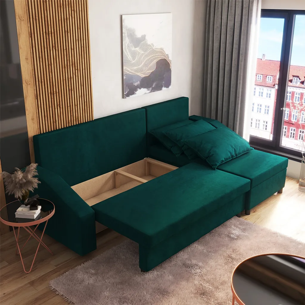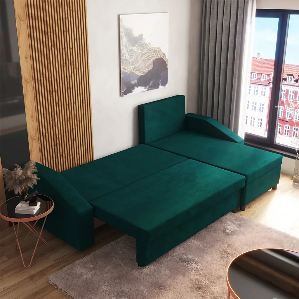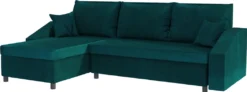 MORABOD ist ein Ecksofa im minimalistischen Design, das sich jedem modernen Interieur anpasst. Das Sofa überzeugt mit seiner schönen Schlichtheit und hohen Funktionalität. Diese bequeme Polsterecke ist mit einem geräumigen Bettkasten ausgestattet und kann leicht in ein Doppelbettverwandelt werden. Für den gewünschten Sitzkomfort sorgen die Schaumpolsterung im Sitz, die einladend weichen, losen Rückenkissen und die großzügige, tiefe Sitzfläche. Dank seinem echt bezogenen Rücken kann das Sofa als stilvoller Raumteiler benutzt werden.