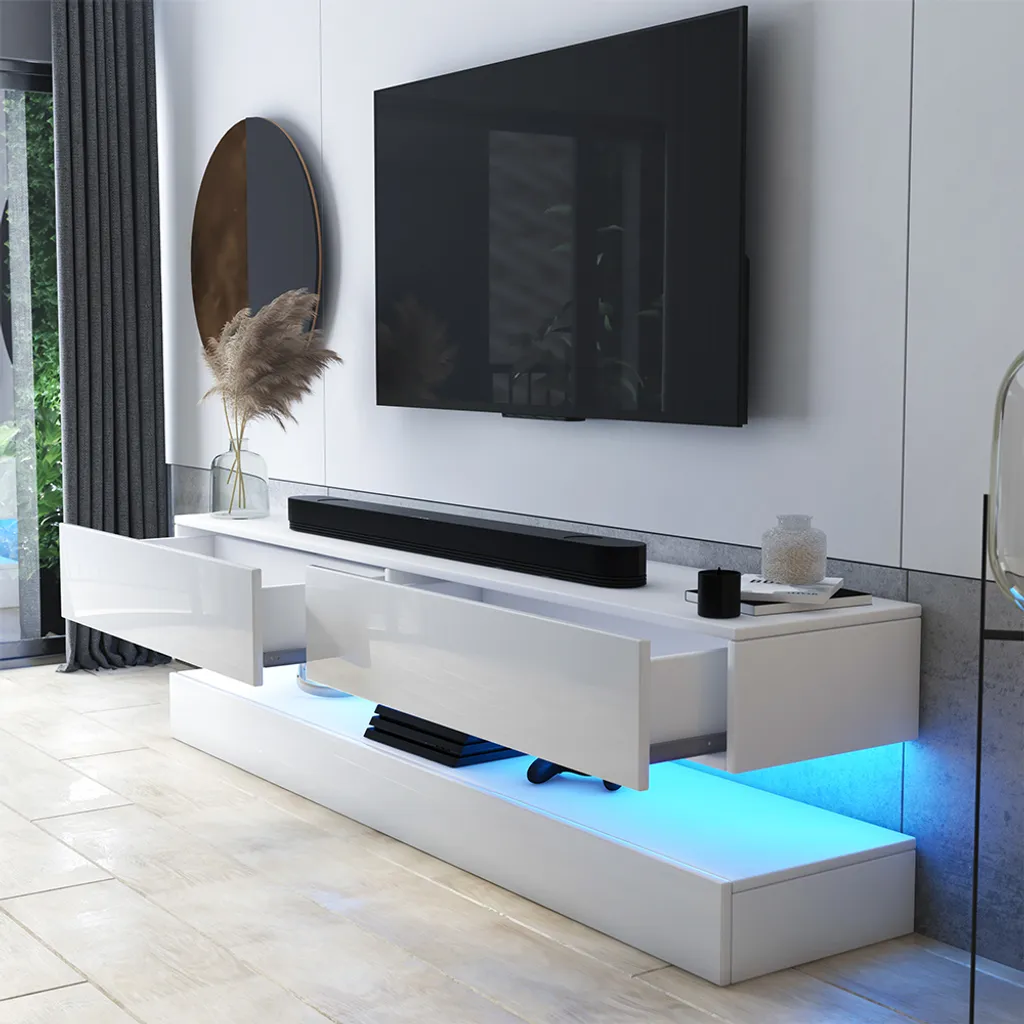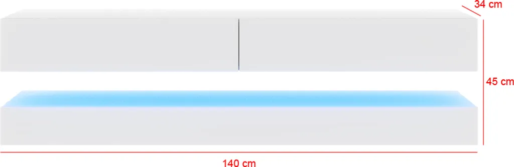 HYLIA ist eine Komposition aus zwei separaten, übereinander hängenden Fernsehschränken mit zwei geräumigen Schubladen im oberen Teil. Die beiden Schubladen nehmen jede Menge auf – sie geben Ihnen auch die Möglichkeit, Ihr Zubehör staubsicher und übersichtlich aufzubewahren. Auf das Hängeboard kommt dann Ihr Fernseher und TV-Geräte. Dank dem schwebenden Eindruck wirkt das Gesamtbild erstaunlich leicht und luftig.