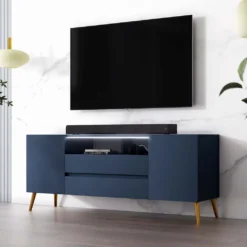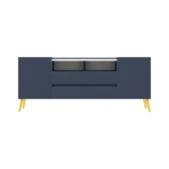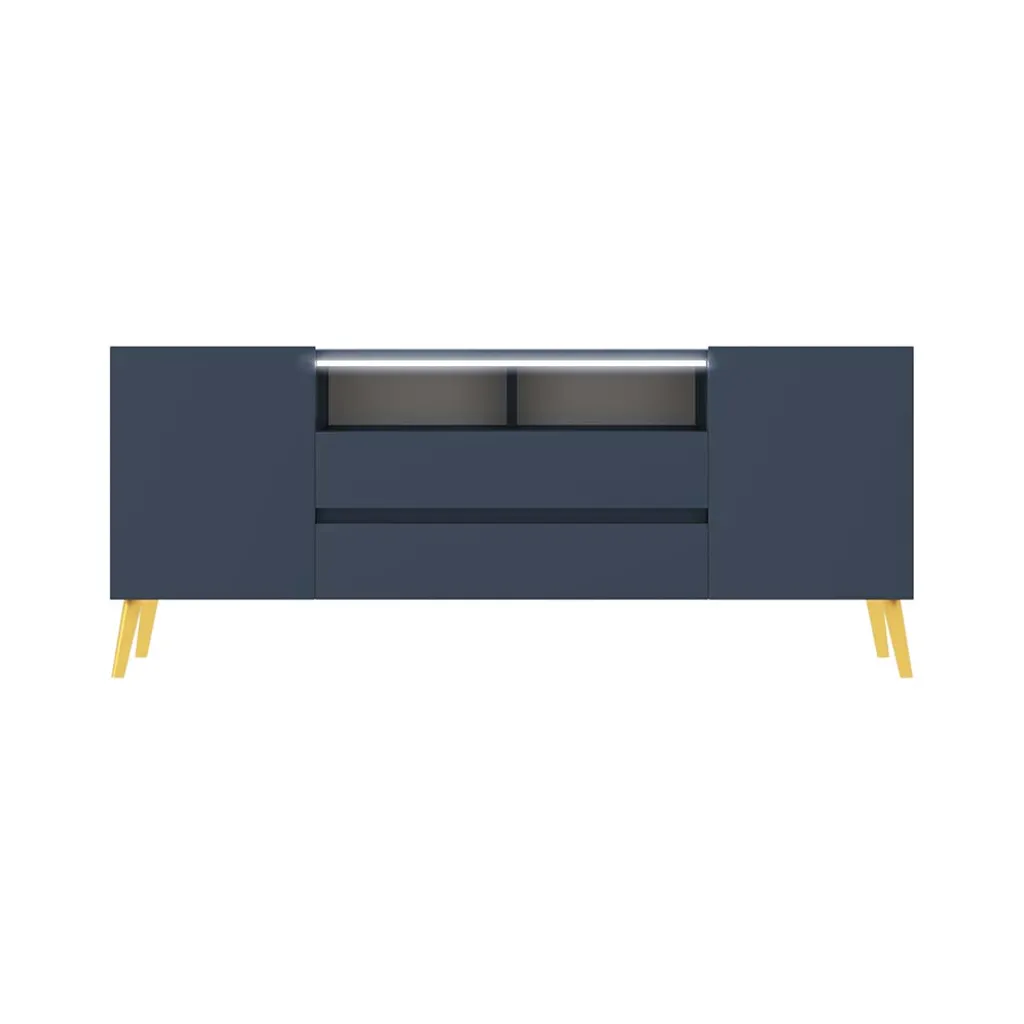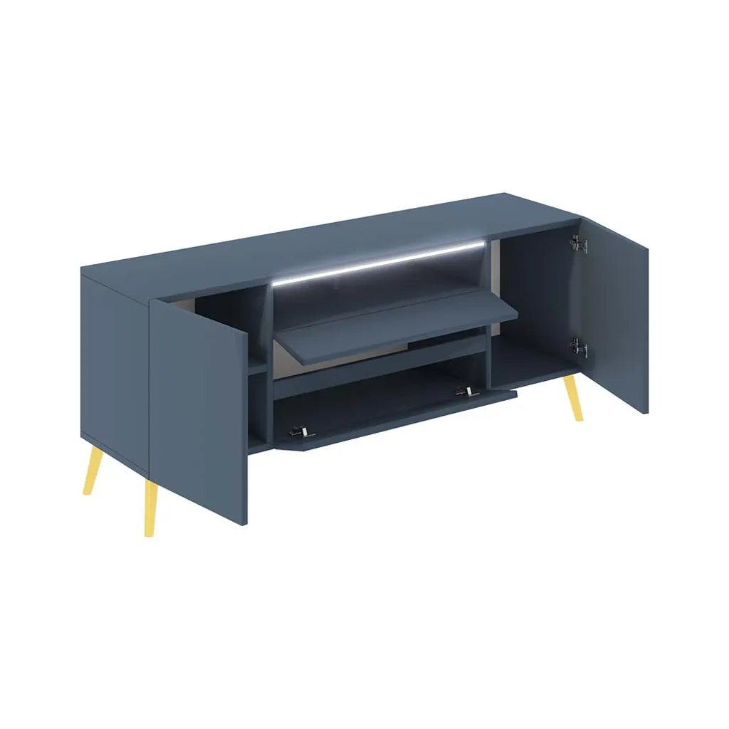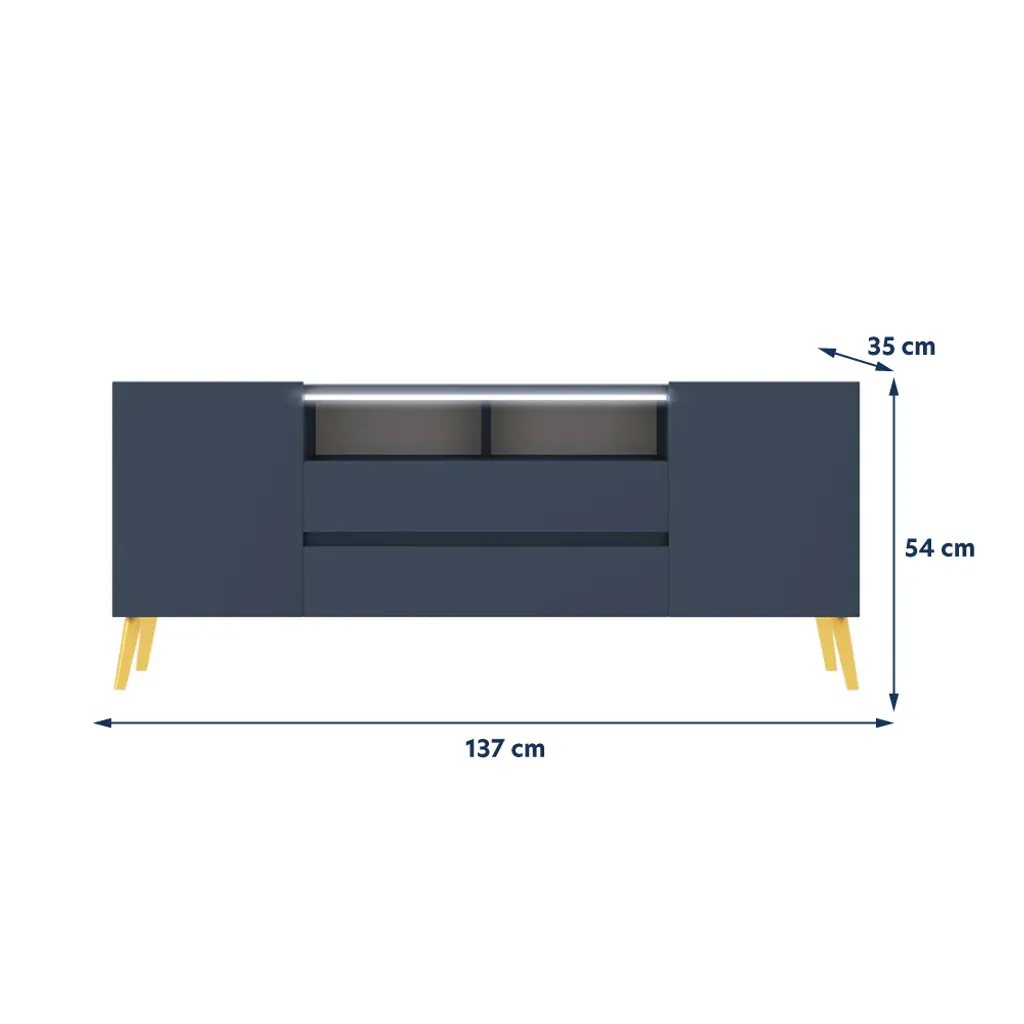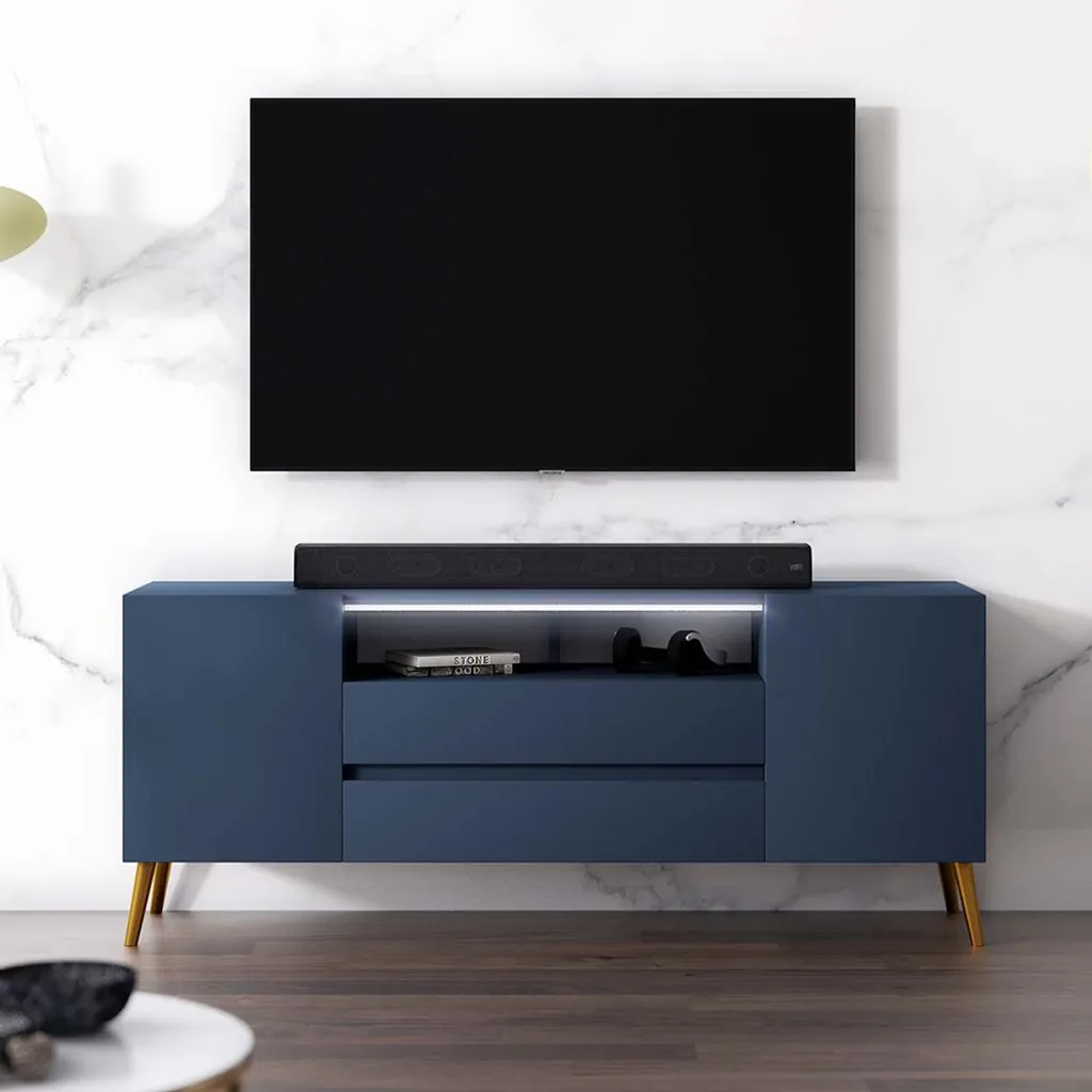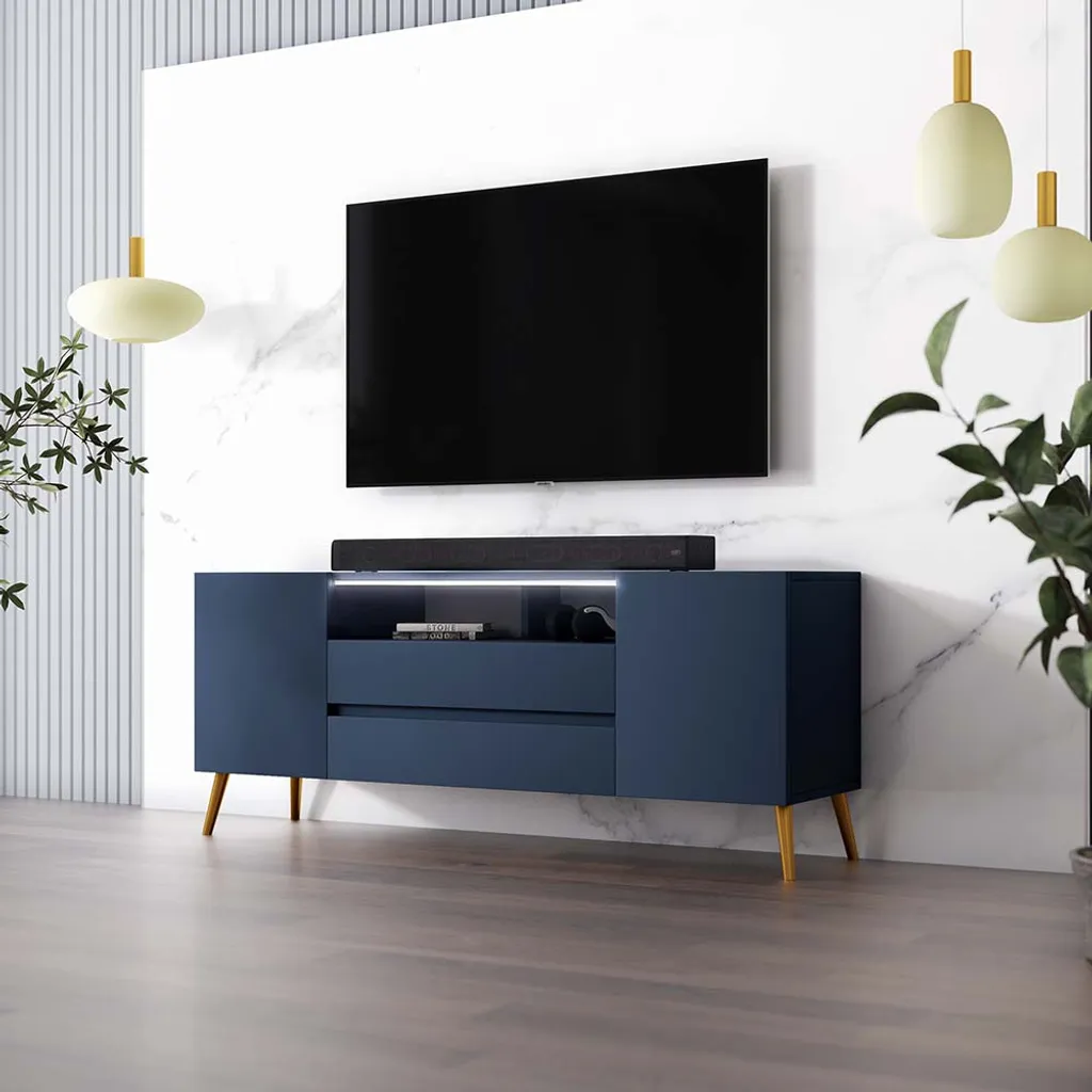 Der TV-Schrank TARVISIO besticht durch sein geschmackvolles Design und zieht alle Blicke auf sich. Die Farbkombination von Dunkelblau und Gold erzeugt einen ansprechenden Look, der sich in vielfältige Wohnstile harmonisch integrieren lässt. Der Korpus besteht aus soliden Möbelplatten, während die Füße aus robustem Metall gefertigt sind. Die 137 cm breite Ablagefläche bringt Ihren Flatscreen gut zur Geltung. Direkt darunter platzieren Sie Ihren Receiver, den DVD-Player oder die Spielkonsole. Ihr Zubehör und weitere Accessoires lassen sich hinter den vier Türen ordentlich verstauen. Durch die LED-Beleuchtung erhält das Möbelstück einen zusätzlichen modernistischen Touch.