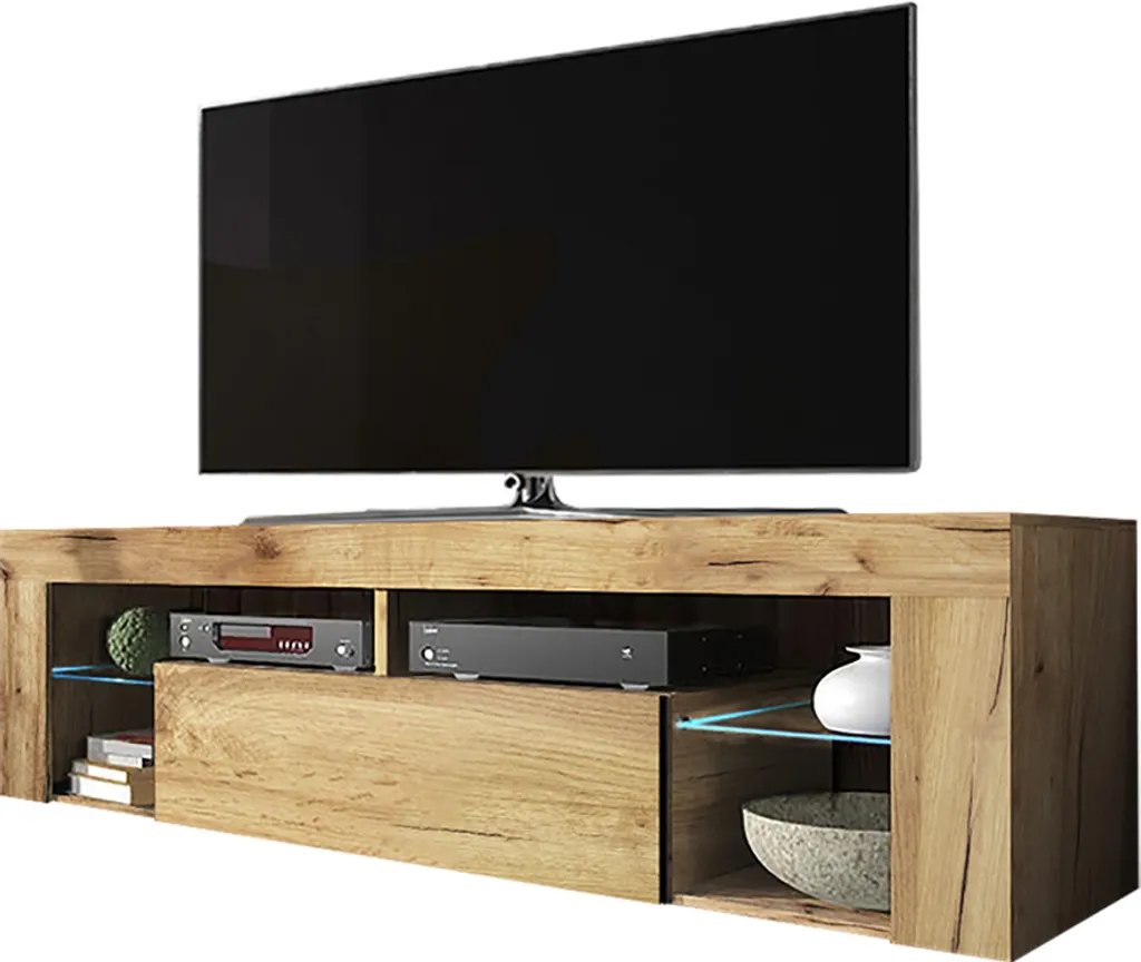 Dieser einzigartige Möbeltyp Hugo ist eine Mischung aus Funktionalität, elegantem und modernem Design. Auch die braune Holzstruktur liegt im Trend. Das TV-Gerät verfügt über eine grifflose Klappe mit Push-up-Funktion an der Vorderseite. Gegenstände, die Sie zur Hand haben möchten, aber nicht im Blick haben, können Sie hier perfekt aufbewahren. Die offenen Fächer können speziell für Multimedia-Geräte, Spielekonsolen, DVD-Player, Audiosysteme, Heimtextilien usw. eingerichtet werden. Dieser TV-Schrank verfügt über 2 Glasböden mit entspannender LED-Beleuchtung, die Ihrem Wohnraum einen tollen Charakter und einen warmen Effekt verleihen. Abmessungen: Breite 140 cm, Höhe 50,5 cm, Tiefe 35 cm. Farbe: braune Holzstruktur. Inklusive LED-Beleuchtung, Montageanleitung und Montagematerial.