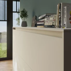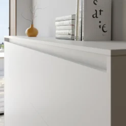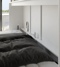 MATERIAL: Spanplatten (16/22 mm Stärke) mit einer hochwertigen Beschichtung aus Melamin, welche sich durch ihre Unempfindlichkeit gegen Kratzer und hohe Temperaturen auszeichnet, bilden die Front des Schrankbettes