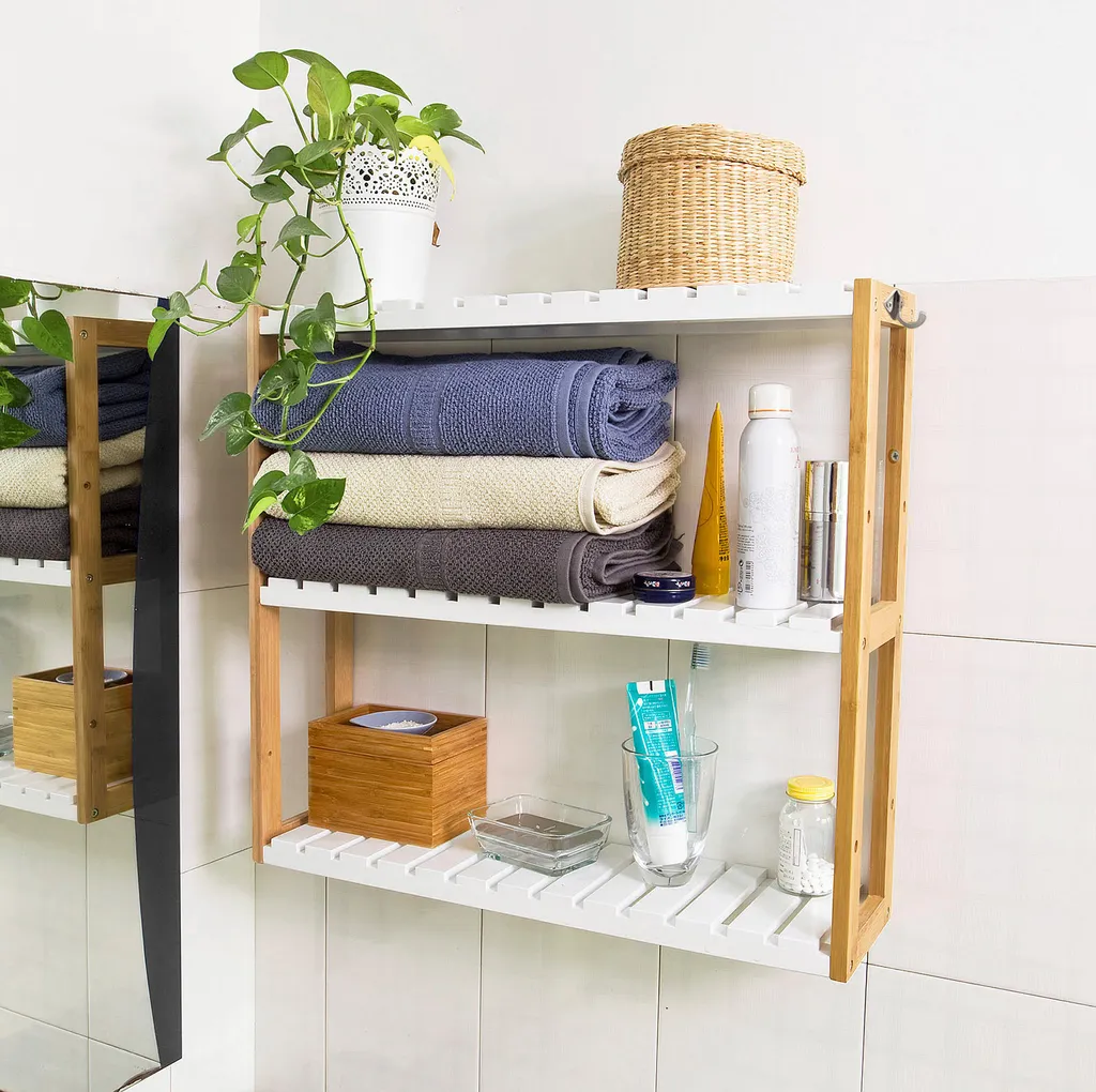 Das Regal bietet optimale Ablageflächen für Handtücher, Kosmetik und andere Kleinigkeiten.