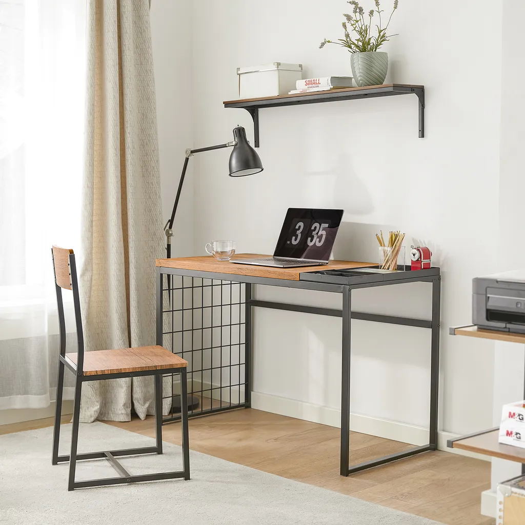 Das Set vereint alle Elemente des Industriestils in sich: Das mattschwarze Gestell bringt ein schlichtes Aussehen, das Metallgitter verleiht ihm eine stilvolle Note, die braune Tischoberfläche schafft eine warme Atmosphäre. Es bringt einen rustikalen Charme in Ihr Arbeitszimmer und schafft eine entspannte Atmosphäre.