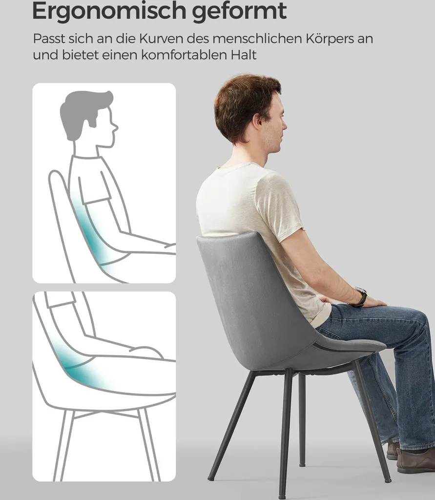 Dank der ergonomisch geformten Sitzschale, die sich der menschlichen Körperform anpasst, und des bequemen, mit Samt bezogenen Sitzkissens sorgen diese 6 Polsterstühle für höchsten Sitzkomfort im Esszimmer