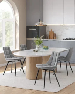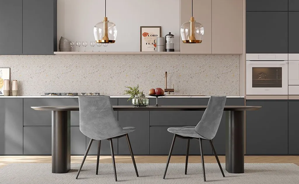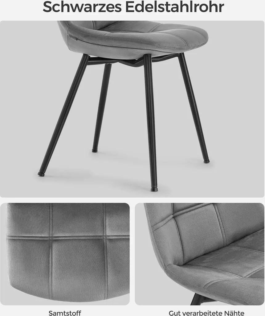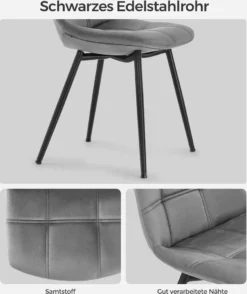 Geschmeidige Linien, schwarze Metallbeine mit Pulverbeschichtung und eine graue Sitzschale mit Chesterfield-Muster – Diese Elemente verleihen diesen Küchenstühlen eine einzigartige Note; stellen Sie diese modernen Sitzmöbel in einen Raum, in dem noch ein wenig guter Stil fehlt