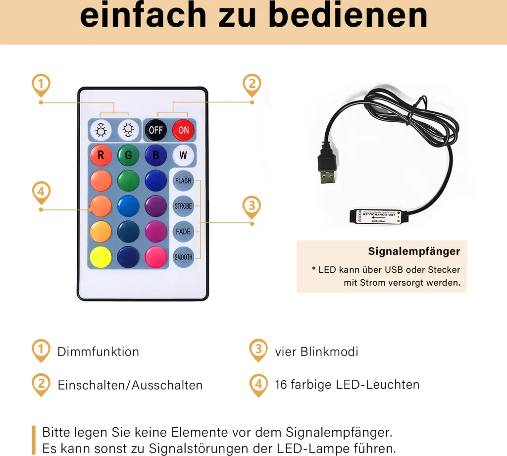 - Die Reichweite der Fernbedienung beträgt ca. 2-3 m. LED kann über USB oder Stecker mit Strom versorgt werden.