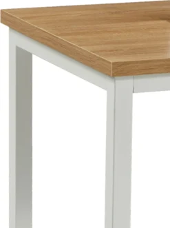 - Material: Tischplatte aus Holzwerkstoff (Eiche), weiße Tischbeine aus Metall