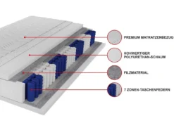Jede Feder ist in einer Tasche verpackt. Eine höhere Anzahl von Federn und deren Verteilung in 7 Zonen je nach Festigkeit sichert beste Körperanpassung und optimale Ventilation.