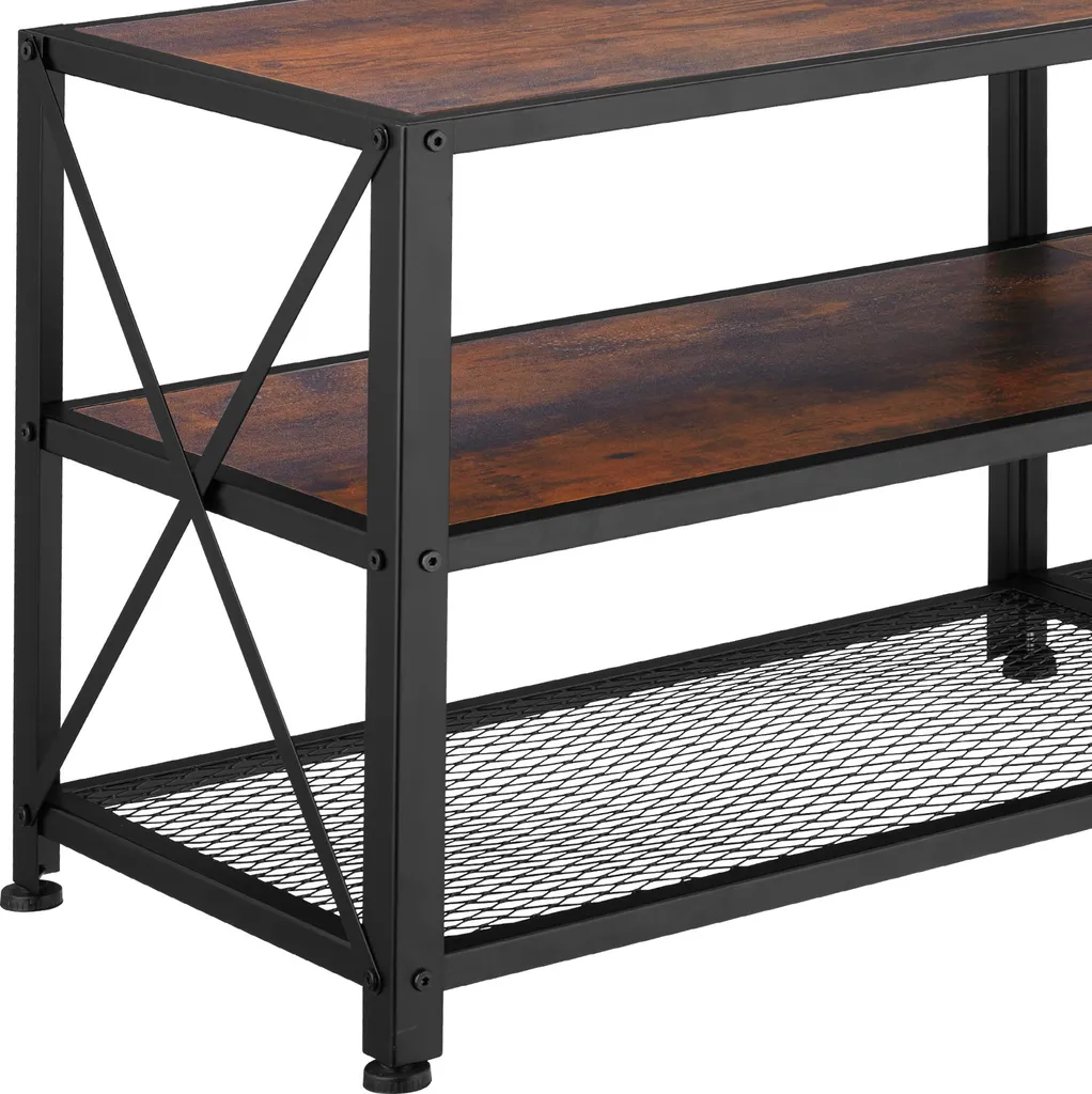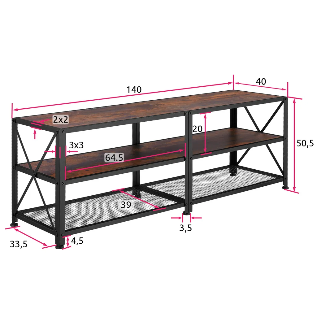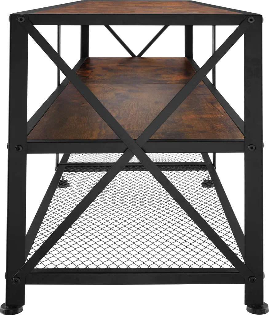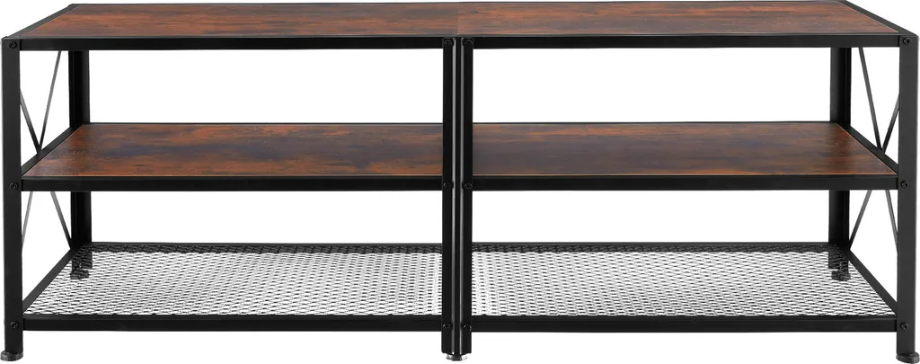 Verpasse Deinem Wohnzimmer einen neuen Hingucker im angesagten Industrial Style mit dem markanten TV-Schrank von tectake. Auf drei Etagen bietet das offen gestaltete Möbelstück aus warmem Holz und kühlem Stahl viel Stellfläche für Fernseher mitsamt Zubehör und schafft ein raues, aber durch und durch wohnliches Ambiente. Die natürlich nachempfundene Maserung der vier pflegeleichten Spanplatten und die seitlichen Streben in X-Form setzen einen charmanten Gegenpol zur ansonsten nüchtern gehaltenen Gestaltung. Für die hohe Stabilität des Lowboards sorgen neben dem soliden Metallrahmen in schickem Schwarz sechs höhenverstellbare Kunststofffüße, die jede Schieflage ausgleichen.