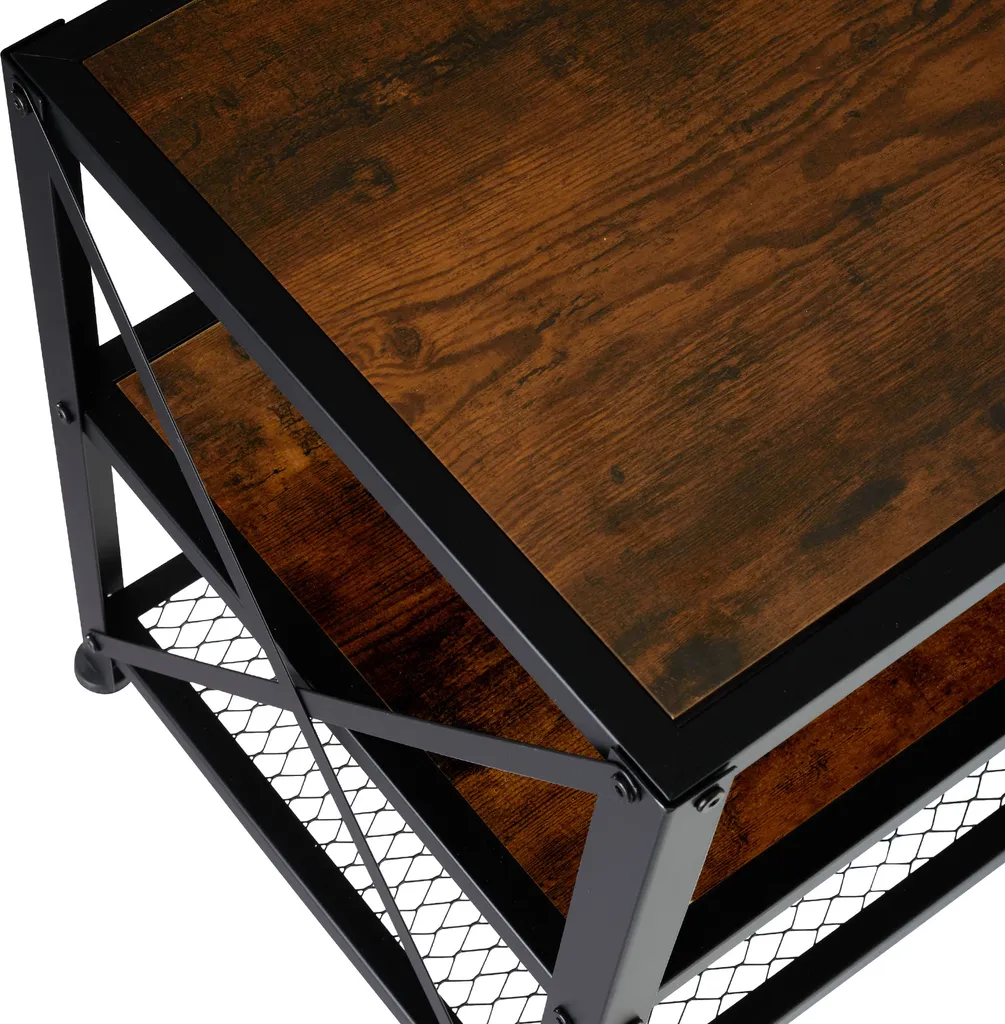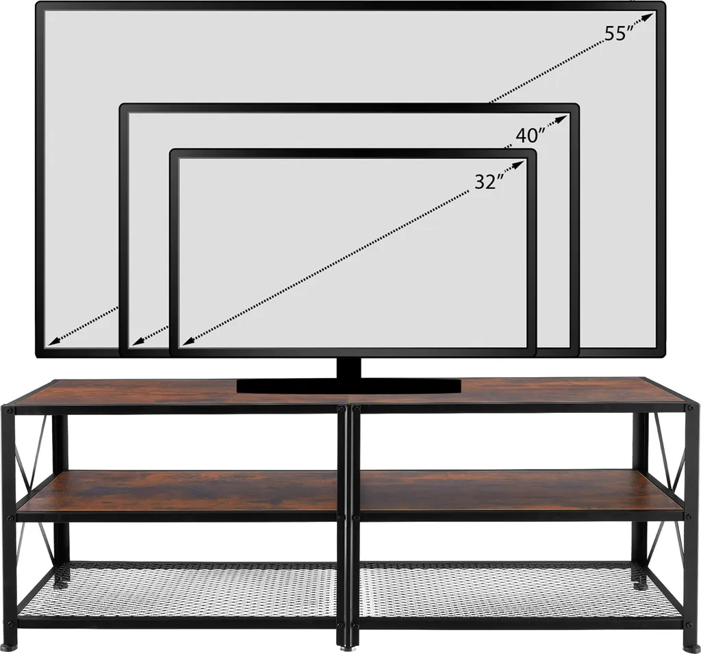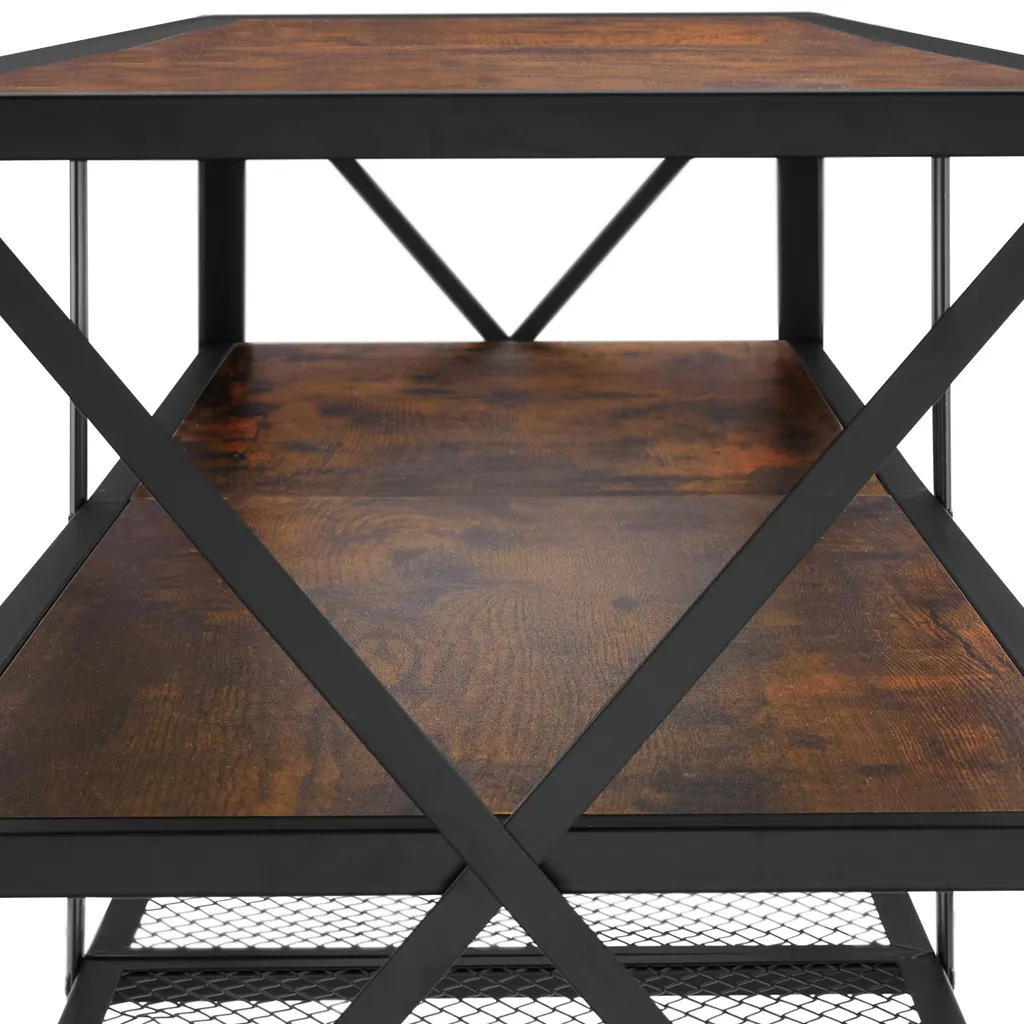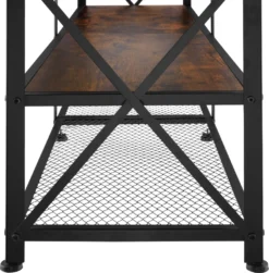 Verpasse Deinem Wohnzimmer einen neuen Hingucker im angesagten Industrial Style mit dem markanten TV-Schrank von tectake. Auf drei Etagen bietet das offen gestaltete Möbelstück aus warmem Holz und kühlem Stahl viel Stellfläche für Fernseher mitsamt Zubehör und schafft ein raues, aber durch und durch wohnliches Ambiente. Die natürlich nachempfundene Maserung der vier pflegeleichten Spanplatten und die seitlichen Streben in X-Form setzen einen charmanten Gegenpol zur ansonsten nüchtern gehaltenen Gestaltung. Für die hohe Stabilität des Lowboards sorgen neben dem soliden Metallrahmen in schickem Schwarz sechs höhenverstellbare Kunststofffüße, die jede Schieflage ausgleichen.