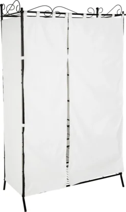 Der elegante Metall-Garderobenschrank mit Vorhang von tectake überzeugt durch schickes Design, großen Stauraum und leichte Pflege. Vorhänge mit Klettverschluss schützen den Inhalt vor Staub und Schmutz. Die nach außen gebogenen Füße des Metall-Stoffschranks sorgen für hohe Stabilität. In sieben Fächern lassen sich unterschiedliche Arten von Kleidung bequem unterbringen. Die vier kleineren Fächer eignen sich gut zur Aufbewahrung von Unterwäsche, T-Shirts und Handtücher, die geräumigeren Fächer für größere Kleidungsstücke. Für Blusen, Hemden, Hosen, Sakkos usw. gibt es eine Kleiderstange. Tipp: Durch die vielen Gestänge lassen sich problemlos weitere Ordnungssysteme anbringen. Ob im Zimmer, Flur, Treppenhaus, Keller, auf dem Dachboden oder in der Studentenbude, der formschöne Metall-Garderobenschrank mit Vorhang von tectake passt perfekt in jede Wohnung.