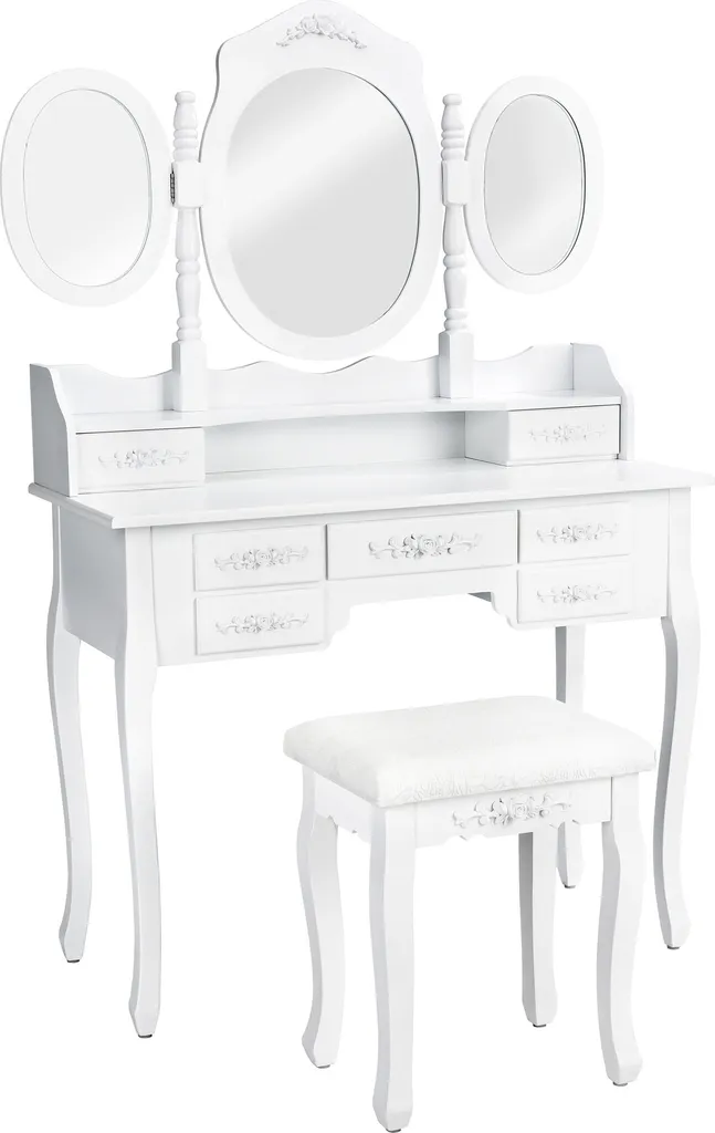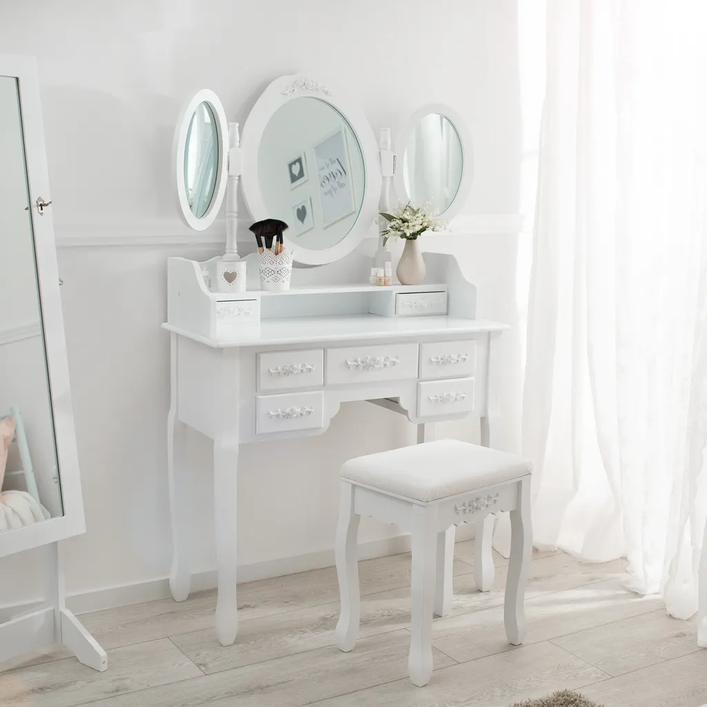 Unser romantischer Schminktisch ist ein wahres Schmuckstück und ein Raumwunder. Die sieben geräumigen Schubladen bieten Platz für all Deine wichtigen Utensilien. Alle Schubladen und auch der bequem gepolsterte Hocker sind mit wunderschönen Rosen-Ornamenten verziert, die sofort ins Auge stechen und sie zu einem Highlight in Deinem Zuhause machen. Ein flexibel um 360° schwenkbarer Ovalspiegel und zwei zusätzliche seitliche Spiegel lassen jede Frisur im Handumdrehen gelingen. Die weiße Holzlackierung von Tisch und Hocker machen dieses Duo perfekt und runden die Optik dieses tollen Schminktisches ab.