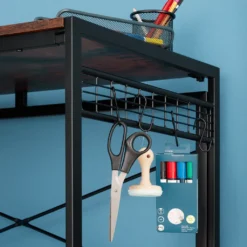 Richte Dir mit wenigen Handgriffen überall ein geschmackvolles Homeoffice ein mit dem klappbaren Schreibtisch Paterson von tectake. In Design und Optik ist die schnörkellose Konstruktion ganz dem markanten Industrie-Stil zuzuordnen, der sich durch den attraktiven Gegensatz von warmem Holz und kühlem Stahl auszeichnet. Ein Eyecatcher sind natürlich die beiden seitlichen Gitterflächen mit ihren praktischen Haken, an denen sich Rucksäcke, Taschen, Kopfhörer und mehr verstauen lassen. Die runden Diagonalstreben, die exakt einstellbaren Schraubfüße sowie die massive Arbeitsplatte sorgen für die hohe Stabilität – zwischen Funktionalität und Eleganz: der vielseitige Schreibtisch Paterson von tectake.