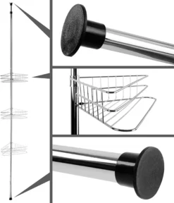 Das Teleskopregal „Emilie“ ist eine praktische Aufbewahrungsmöglichkeit für Pflegeprodukte und passt sich dank seiner variablen Länge Raumhöhen flexibel an. Ausgestattet mit drei Körben, bietet das Teleskopregal in der Dusche oder neben der Badewanne ausreichend Stellfläche und nutzt dabei die Ecke des Raumes optimal aus.