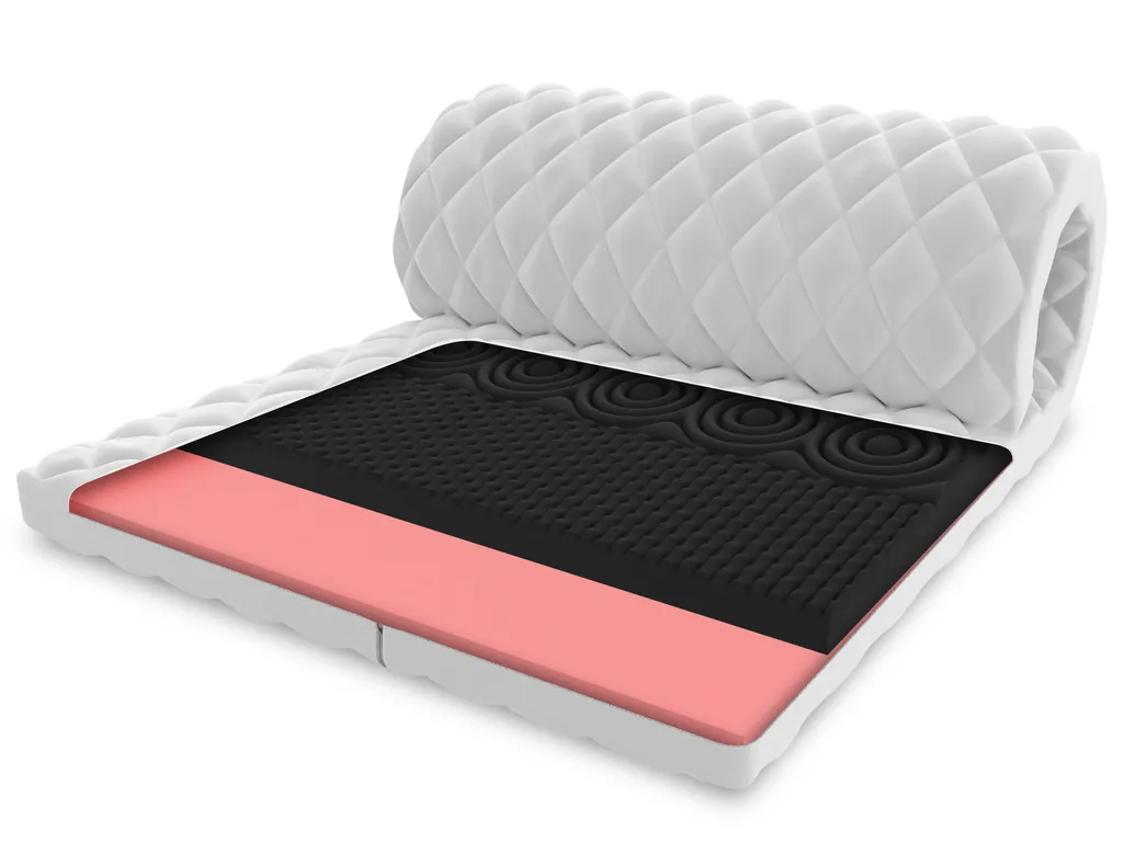 Die Matratzenauflage besteht aus zwei Schaumstoffen mit einzigartigen Eigenschaften, was sich in einem hohen Nutzungskomfort niederschlägt. Die oberste Schicht besteht aus hochelastischem HR-Schaum, der aufgrund seiner Eigenschaften ein sehr beliebtes Material für Matratzen ist. Es ist sehr haltbar und widerstandsfähig gegen Verformung. Es zeichnet sich auch durch seine Haltbarkeit und Elastizität aus und kehrt schneller in seine ursprüngliche Form zurück als gewöhnliches Polyurethan. Die profilierte Oberfläche sorgt dafür, dass die Liegefläche in 7 Zonen unterschiedlicher Härte unterteilt ist. Dadurch passt er sich perfekt an die Körperformen an und ist sehr bequem. Seine innere Struktur sorgt für eine sehr gute Luftdurchlässigkeit, so dass die Hygiene leicht aufrechterhalten werden kann.