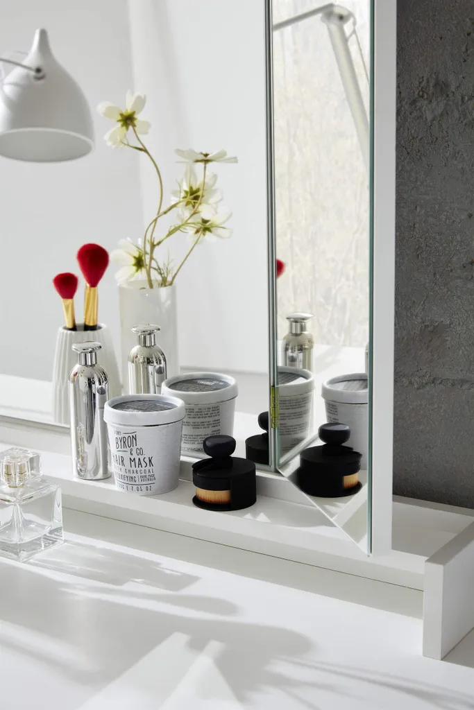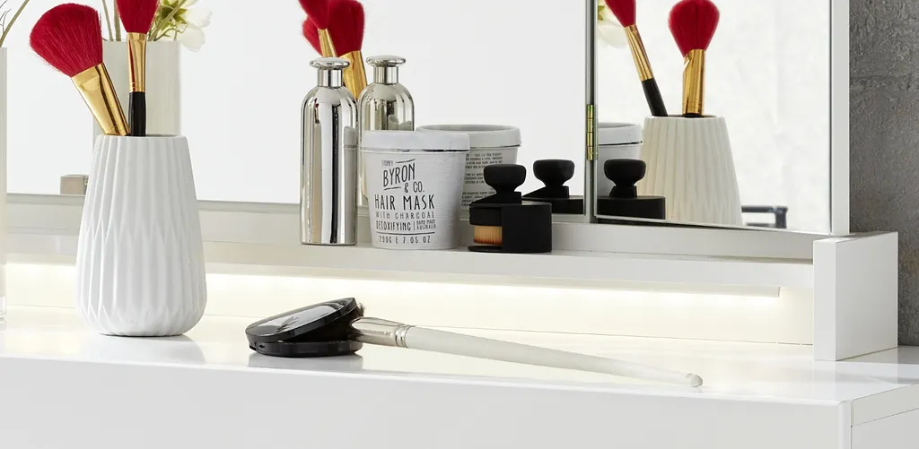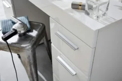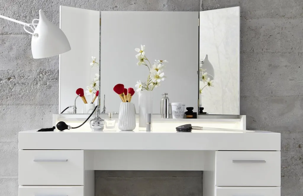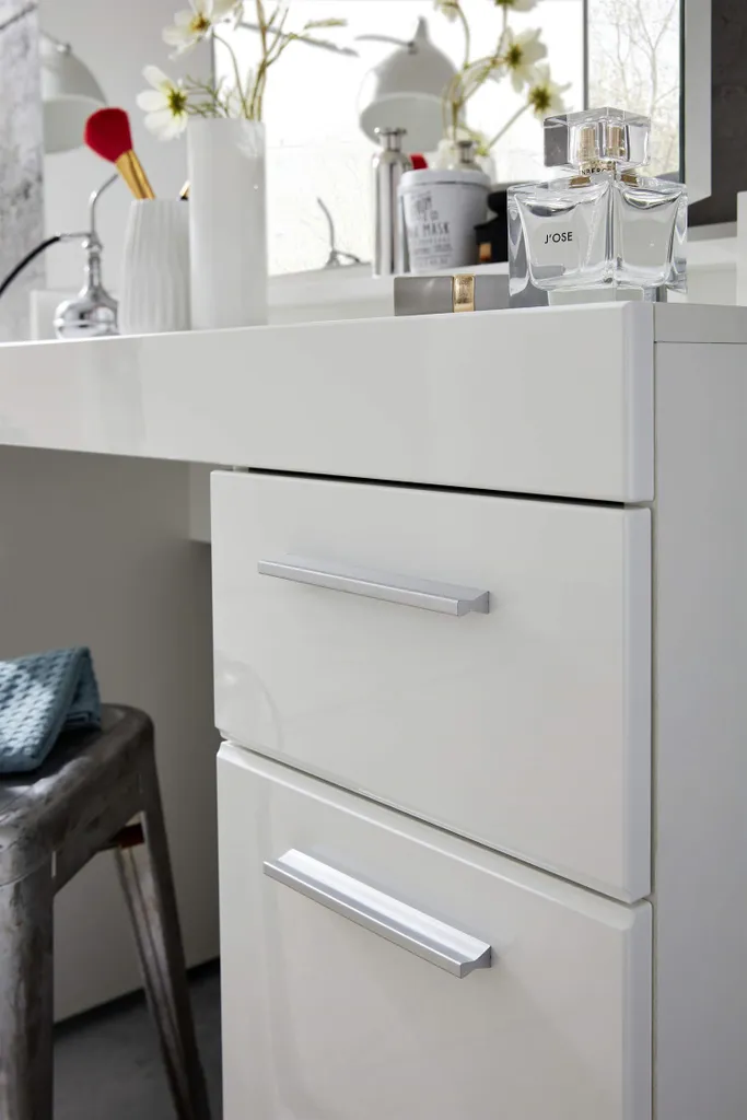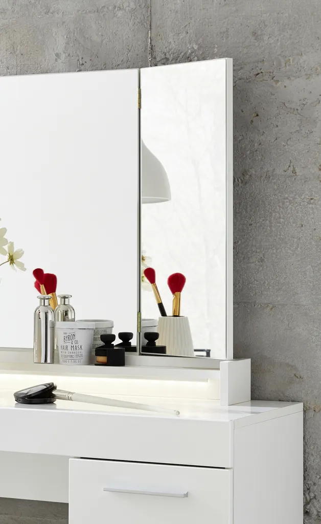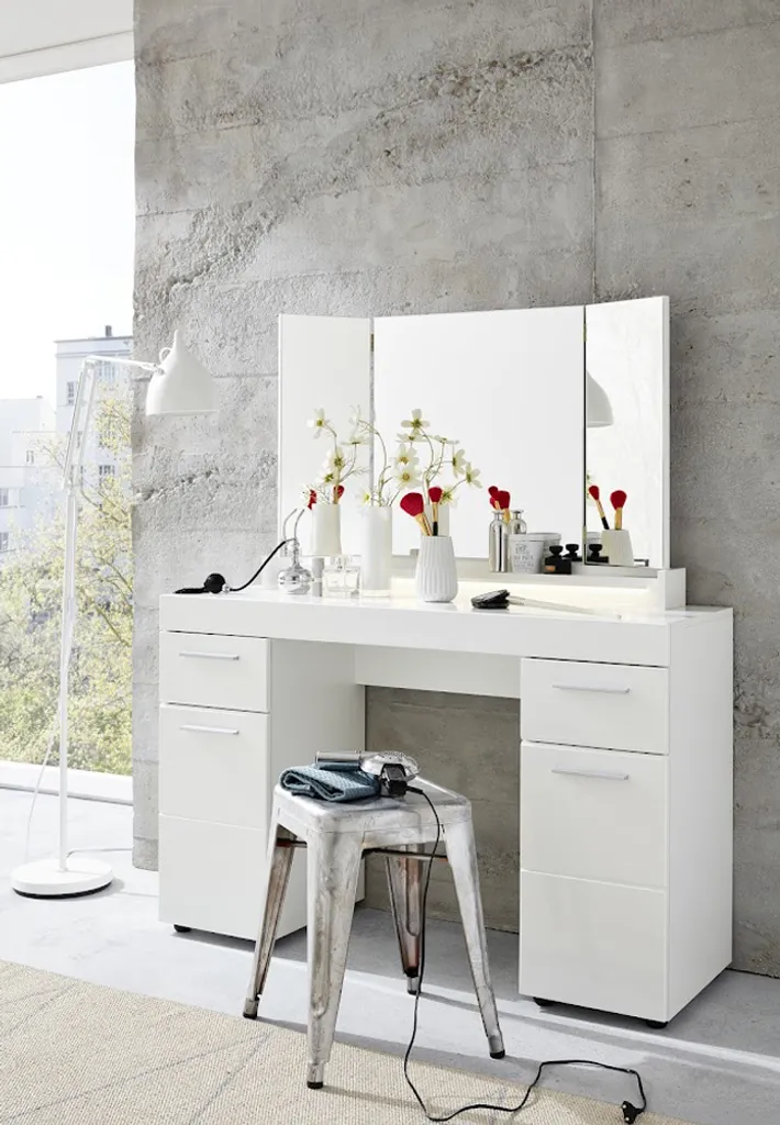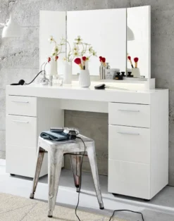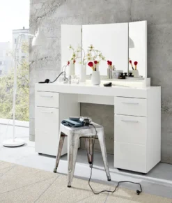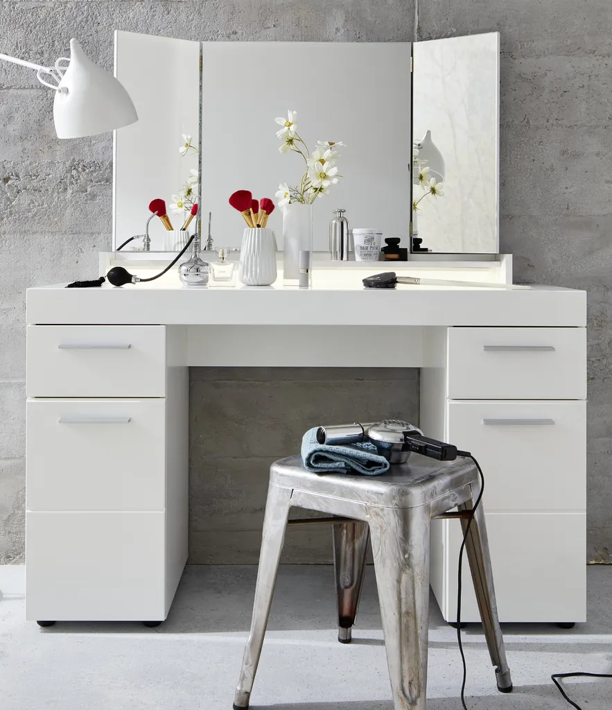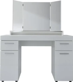 Der Schminktisch Amanda bietet viel Stauraum in Form von zwei Schubladen und geschlossenen Fächern. Mit seinem Schlichten und modernen Design passt er sich jeder Raumdekor an.