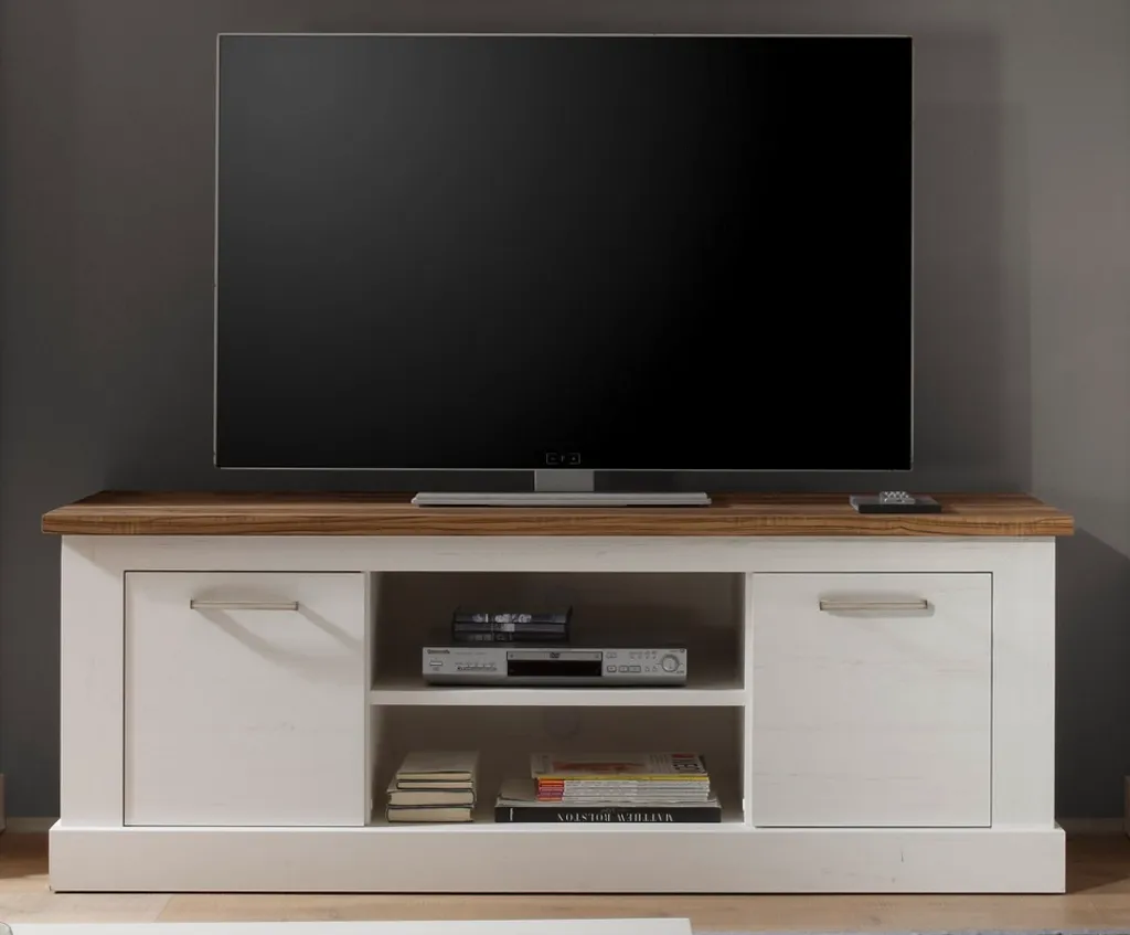 TorontoWohnen TV Tisch 2 Türen, 2 offene Fächer Pinie weißNachbildung, NussbaumNachbildung. Farbton Korpus: Pinie Weiß StrukturNachbildung. Farbton Front: Pinie Weiß StrukturNachbildung. Farbton Absetzung: Satin Nussbaum. Sie erhalten Möbel aus guter Qualität mit guten Komfort, gefertigt in einem stilvollen und modernen Design. Schaffen Sie Ihren ganz eigenen und persönlichen Stil in Ihren Heim mit neuen Möbeln. Kombinieren Sie die Möbel mit anderen Kleinmöbeln oder schicken Wohnaccessoires. Sie sind mit der Mode und den neuen Wohntrends, wie man Sie in Zeitschriften und Magazinen sieht. Bei uns finden Sie einzigartige, schicke und komfortable Möbel. Die Möbel sind alle in einem trendigen Design.
