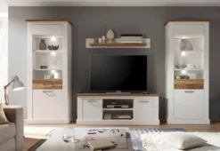 Die trendige Wohnkombination Toronto ist ein Schmuckstück im Landhausstil. Die Wohnwand hat an Front und Korpus ein helles Design aus Anderson Pinie Nachbildung. Absetzungen in Satin Nussbaum Nachbildung sorgen für eine aufgelockerte Optik des massiv wirkenden Wohnzimmerschrankes. Er lässt sich ganz individuell planen. Das TV-Unterteil Toronto umfasst 2 Türen und 2 Fächer, welche viel Stauraum und einen optimalen Platz für Ihren Fernseher bieten. Die Korpusstärke des TV-Unterteils Toronto liegt bei 15 mm. Die Frontplatten sind 16 mm stark. Die leicht überstehenden Oberböden der Schränke haben eine Dicke von 32 mm. Das Rahmenprofil an der Front liegt bei 18 mm. Die gehobene Qualität wird durch dekorative Möbelgriffe aus Metall und Metallbeschläge unterstrichen. Die Glaseinsätze in den Vitrinen sind aus ESG-Klarglas. Die Glasböden wurden 4-seitig matt geschliffen.