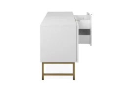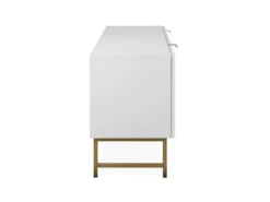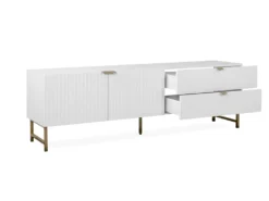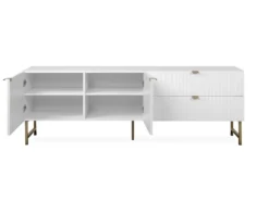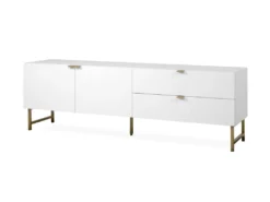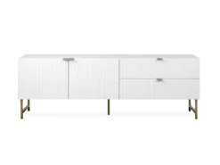 Das TV-Lowboard „Elwood I“ ist in mattem Weiß erhältlich, welches stilvoll mit einer 3D-Front kombiniert wird. Edle Akzente setzen hier die Füße und die Griffe in mattem Gold. Dank dieser Farbgebung wird dem jeweiligen Zimmer nicht nur eine moderne Atmosphäre, sondern auch eine stilvolle Erscheinung verliehen.