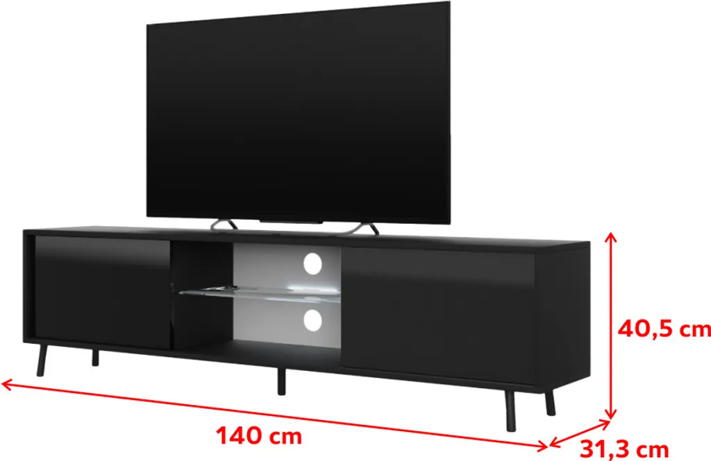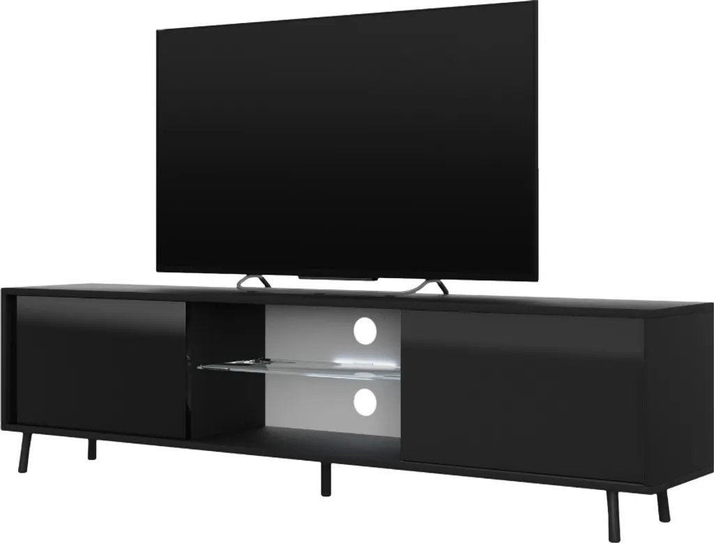 Geradliniges, griffloses Design wirkt modern und minimalistisch. Der Einlegeboden aus gehärtetem Glas verleiht dem TV-Lowboard Transparenz und optische Leichtigkeit, die zusätzlich durch die Füße, die den Schrank 10,5 cm hoch über dem Boden tragen, gesteigert wird. Schalten Sie die integrierte LED-Beleuchtung (batteriebetrieben)an und tauchen Sie den Glaseinlegeboden ins coole, weiße Licht ein!