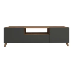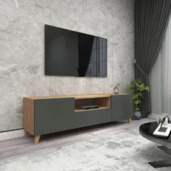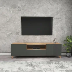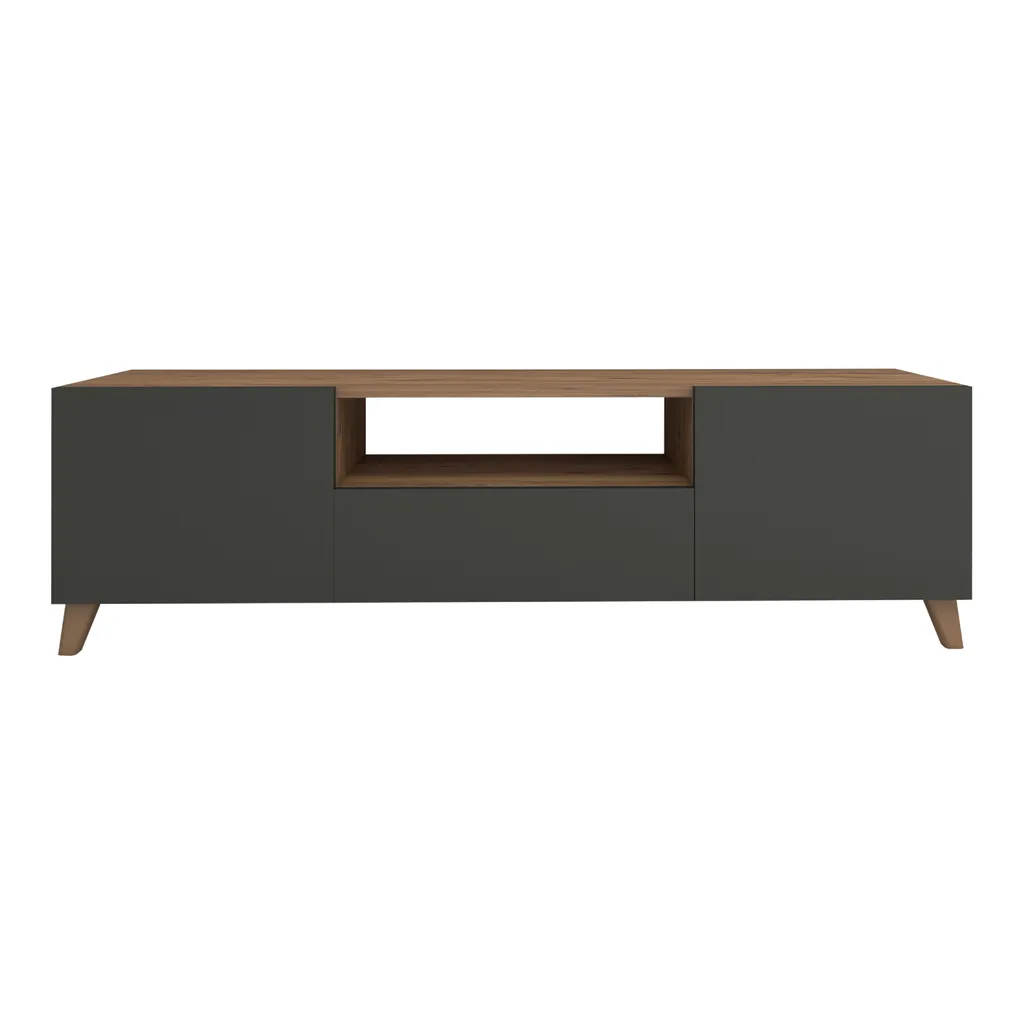 Dieser moderne und dekorative Fernsehtisch verfügt über insgesamt 3 Schranktüren. Außerdem bietet er durch die Ablage in der Mitte einen zusätzlichen Stauraum.