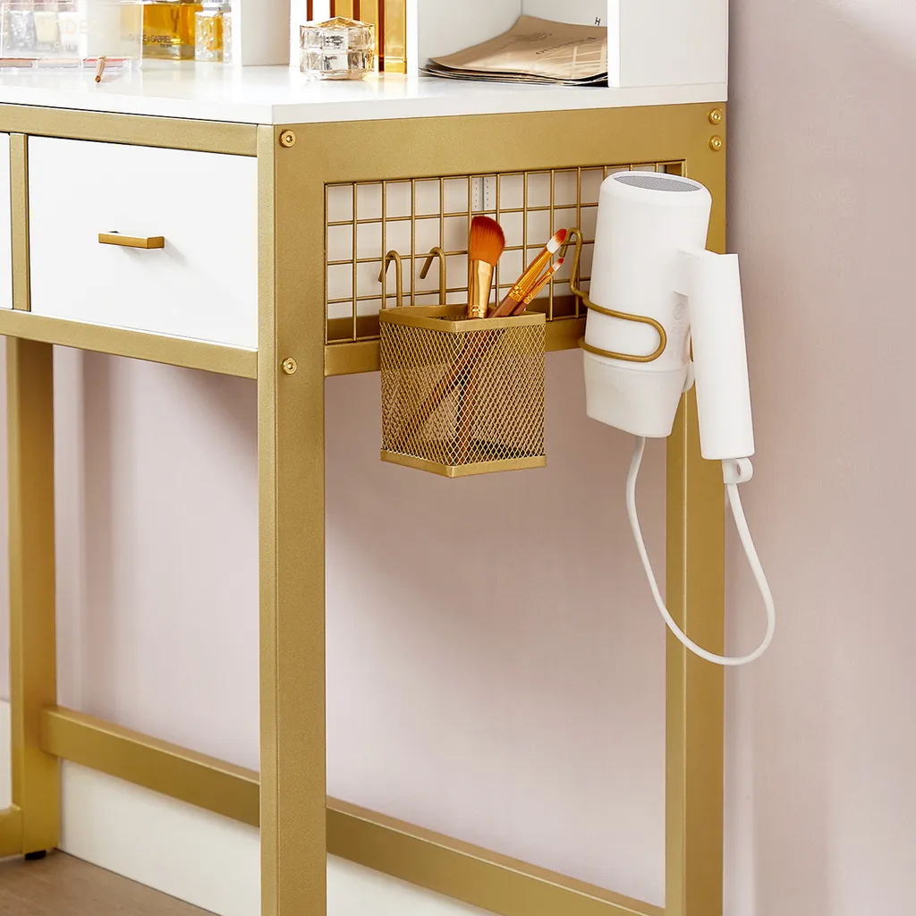 4 offene Fächer für Ihre Kosmetika, 3 Schubladen für Ihre Schönheitsgeheimnisse! Was noch? Ein Haartrockner-Halter, mit dem Sie sich jeden Tag fühlen, als kämen Sie gerade aus dem Friseursalon!
