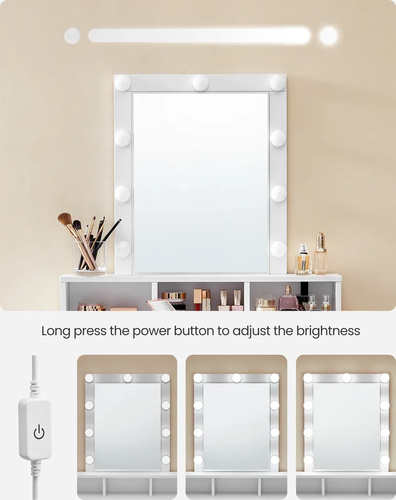 Verabschieden Sie sich von verschmiertem Make-up, welches Ihren kompletten Look ruiniert. Die 9 dimmbaren Glühbirnen, die den Spiegel umgeben, erhellen Ihren Beautybereich und machen einen perfekten Lidstrich möglich