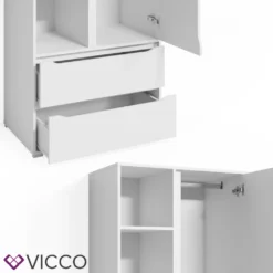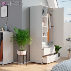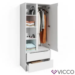 Dieser funktionale Kleiderschrank präsentiert sich in einem modernen Design. Er bietet mit den großen Schubladen, den Fächern und der Kleiderstange viel Stauraum und Platz für Ihre Besitztümer. Die grifflosen Fronten und das schlichteNachbildung fügen sich bestens in Ihre Wohnwelt ein. Dieser stilvolle Schrank bildet eine tolle Ergänzung zu unseren anderen Möbelstücken der Ruben Serie. Kombinieren Sie sie ganz nach Ihren Bedürfnissen und schaffen sich ein perfektes Zuhause.