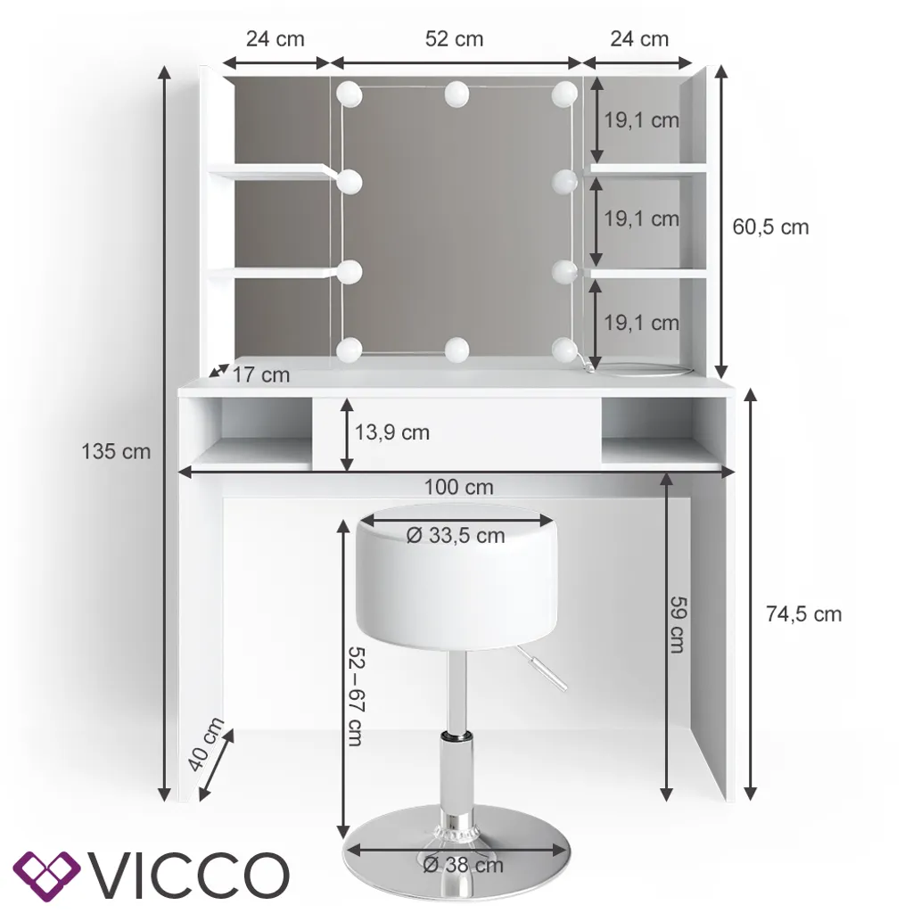 Schminktisch: 99 x 133,4 x 40,1 cm (BxHxT)