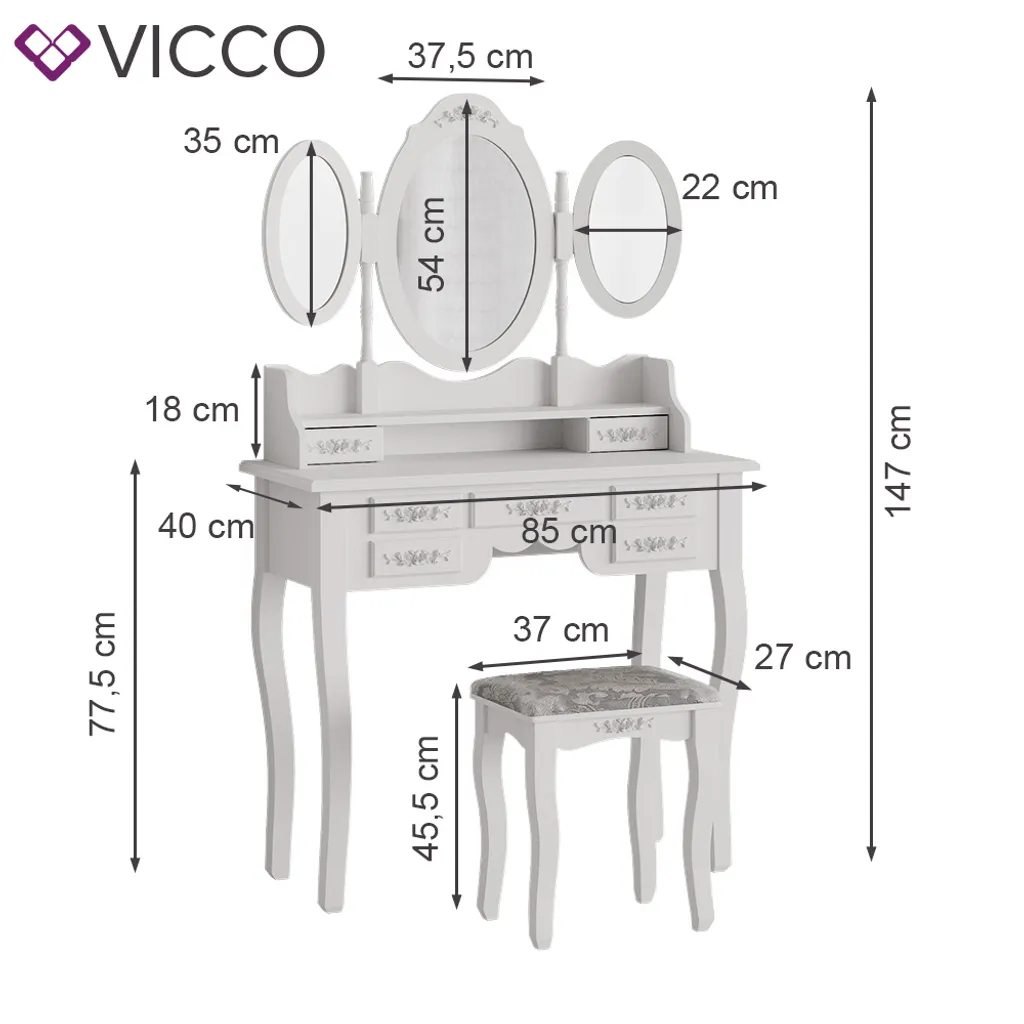 – Die Gesamtmaße des Schminktisches betragen 85 x 147 x 40 cm (BxHxT) und die des Hauptspiegels 37,5 x 54 cm (BxH).