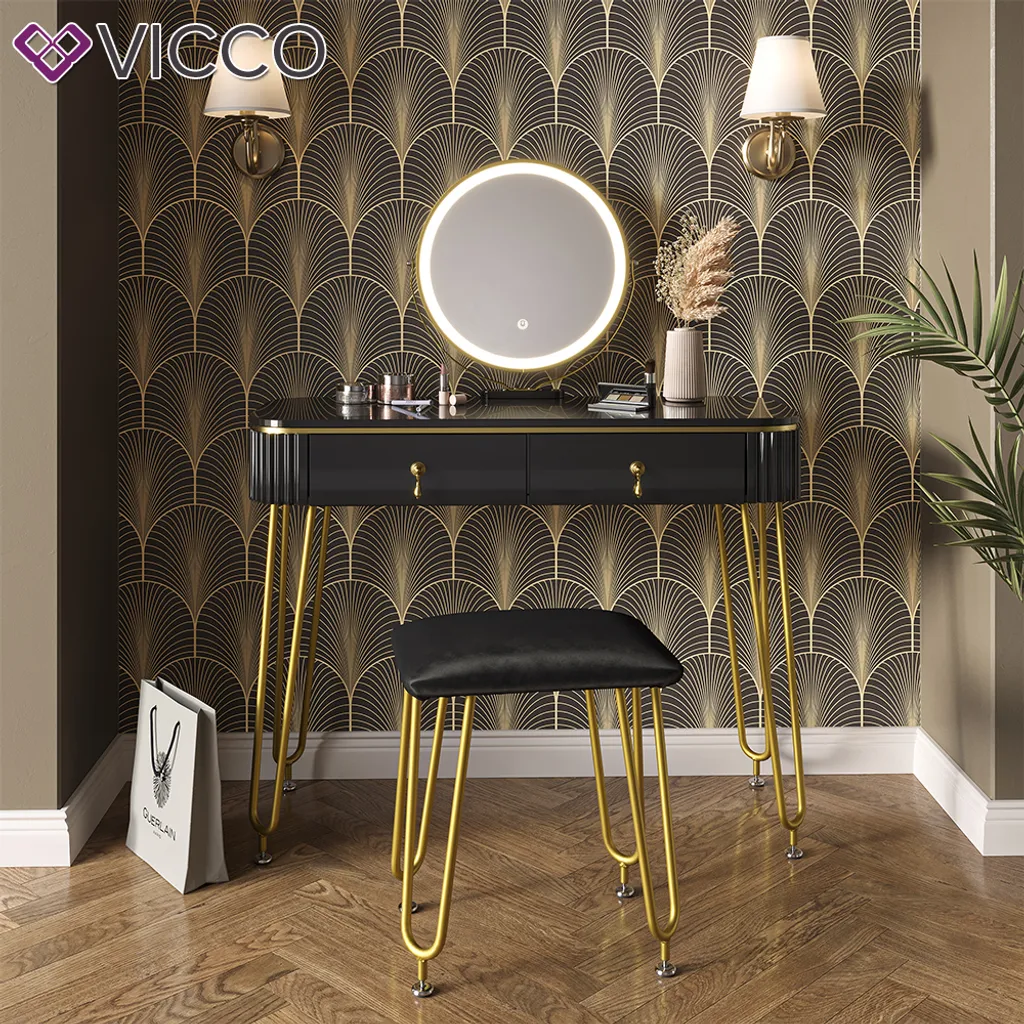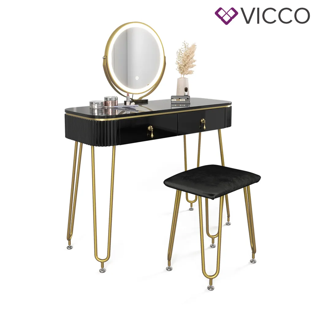 Der dazugehörige formschöne Designhocker verspricht eine edle Optik und bietet zusätzlich einen komfortablen, weichen Sitz. Er lässt sich platzsparend unter den Schminktisch stellen.
