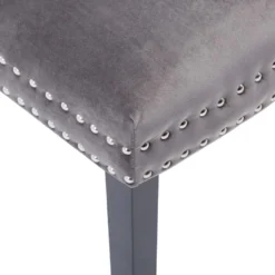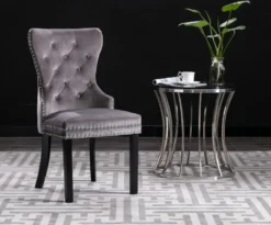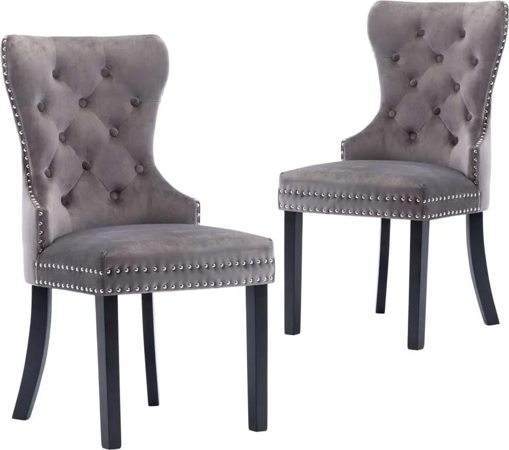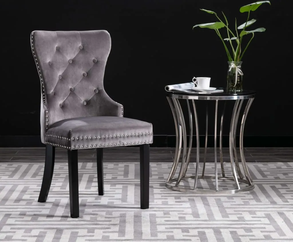Diese mit weichem Samt bezogenen Esszimmerstühlen bietet einen bequemen Platz zum Essen, Lesen oder einfach nur zum Entspannen. Die dekorativen Knöpfe an der Rückenlehne und die Metallnieten an den Kanten heben die klassische Schönheit des Stuhls noch mehr hervor. Getragen von Beinen aus Gummibaum-Massivholz, sind diese Esszimmerstühle stabil und robust.