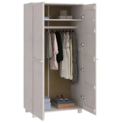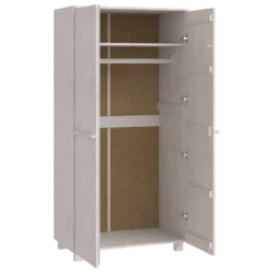 Aus massivem Kiefernholz gefertigt, ist dieser Schrank stabil und robust. Der Kleiderschrank verfügt über ein kleines oberes Fach und ein großes unteres Fach mit einer Kleiderstange, die reichlich Platz bieten, um auch längere Outfits und verschiedene andere Accessoires übersichtlich aufzubewahren.