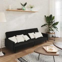 Der Holzrahmen trägt zur Robustheit des Schlafsofas bei, während die dicke Polsterung aus Schaumstoff zusätzlichen Komfort bietet. Das Schlafsofa lässt sich ganz schnell und einfach von einem Sofa in ein Bett und wieder zurück verwandeln. Dabei können Sie die zwei separaten Kissen teilweise oder vollständig hinunterbringen, um den idealen Platz für ein Nickerchen oder ein Doppelbett zu schaffen.