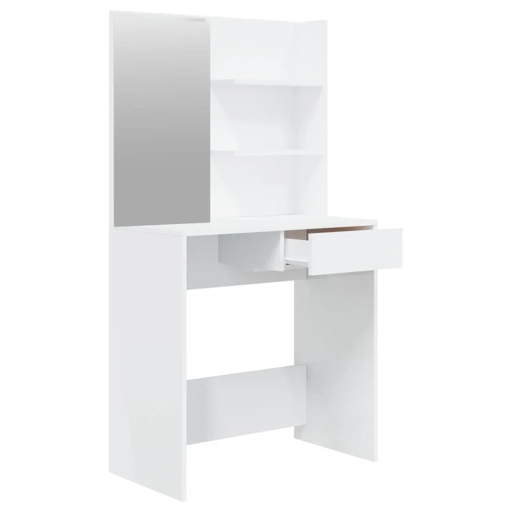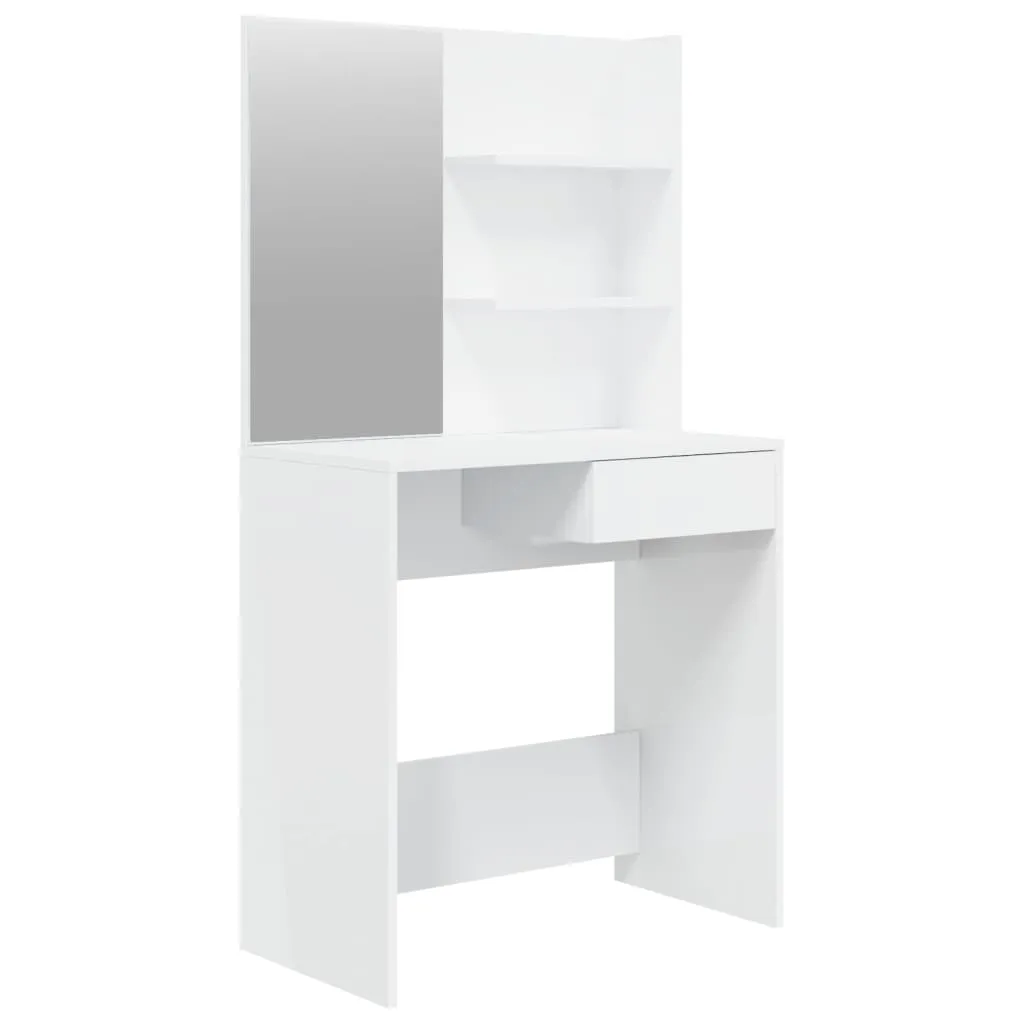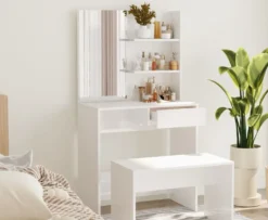 Mit seinen raffinierten geraden Linien und seiner asymmetrischen Form voller Originalit?t wird dieser Schminktisch mit Sicherheit alle Blicke auf sich ziehen! Stabiles Material: Holzwerkstoff ist ein Material hoher Qualit?t mit glatter Oberfl?che, das sich durch Festigkeit, Stabilit?t und Feuchtigkeitsbest?ndigkeit auszeichnet.Allzweckspiegel: Der Schminktisch mit Spiegel eignet sich perfekt fš¹r deine t?gliche Sch?nheitsroutine. Der Spiegel erm?glicht es dir, deine Gesichtshaut zu pflegen und auch dein Make-up aufzutragen!Reichlich Stauraum: Die Tischplatte, die zwei Ablagen š¹ber dem Tisch und eine Schublade unter dem Tisch bieten reichlich Platz fš¹r Make-up, Schmuck und andere Alltagssachen.Modernes Design: Durch klare Linien, minimalistischen Look und modernes Design fš¹gt er sich harmonisch in deine Inneneinrichtung ein. Warnung:Um das Umkippen zu verhindern, muss dieses Produkt mit der mitgelieferten Wandhalterung gesichert werden. Hinweis:Jedes Produkt wird mit einer Montageanleitung in der Verpackung fš¹r eine einfache Montage geliefert.