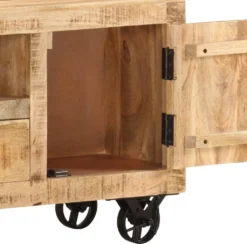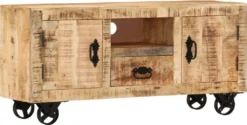Der TV-Schrank wurde in Handarbeit aus massivem rauhen Mangoholz gefertigt, welches äußerst stabil, langlebig und ästhetisch ist. Seinen spektakulären Retro-Look erhält der Schrank durch die Handanfertigung, wobei hier jeder Arbeitsschritt mit größter Sorgfalt durchgeführt wird, sei es Polieren oder Lackieren. Die Handwerkskunst und die schönen Holzmaserungen machen jedes Möbelstück zu einem Unikat. Der Fernsehtisch verfügt zudem über 2 Schranktüren, 1 Schubfach und 1 Regal, welche großzügigen Stauraum für Multimedia-Geräte, Datenträger und sonstige Gegenstände, die Sie präsentieren oder in Griffweite haben möchten, bereitstellen. Das industrielle Design des Schrankes wird mit 4 Eisenrädern abgerundet, zudem erleichtern die Räder auch das Verschieben des Schrankes.
