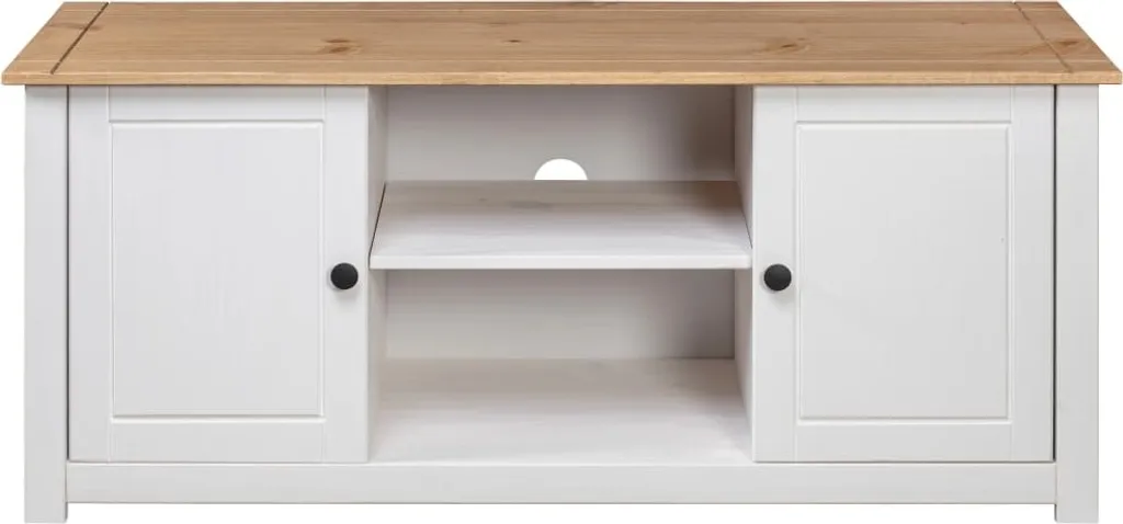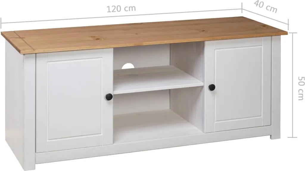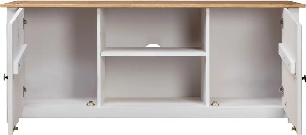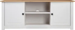 Dieser aus massivem Kiefernholz gefertigte TV-Schrank ist äußerst robust und langlebig. Das elegante Design macht das Lowboard zu einer benutzerfreundlichen und außergewöhnlich dekorativen Ergänzung für Ihr Zuhause. Der Stereoschrank verfügt über 2 Türen und 2 Fächer und bietet dadurch ausreichend Platz, um kleinere Gegenstände wie Schlüssel, Notizblöcke, Stifte und andere Kleinigkeiten ordentlich und griffbereit aufzubewahren. Darüber hinaus bietet die große Oberplatte den idealen Platz für Ihren Fernseher, Router, Multimedia-Geräte oder Ziergegenstände.