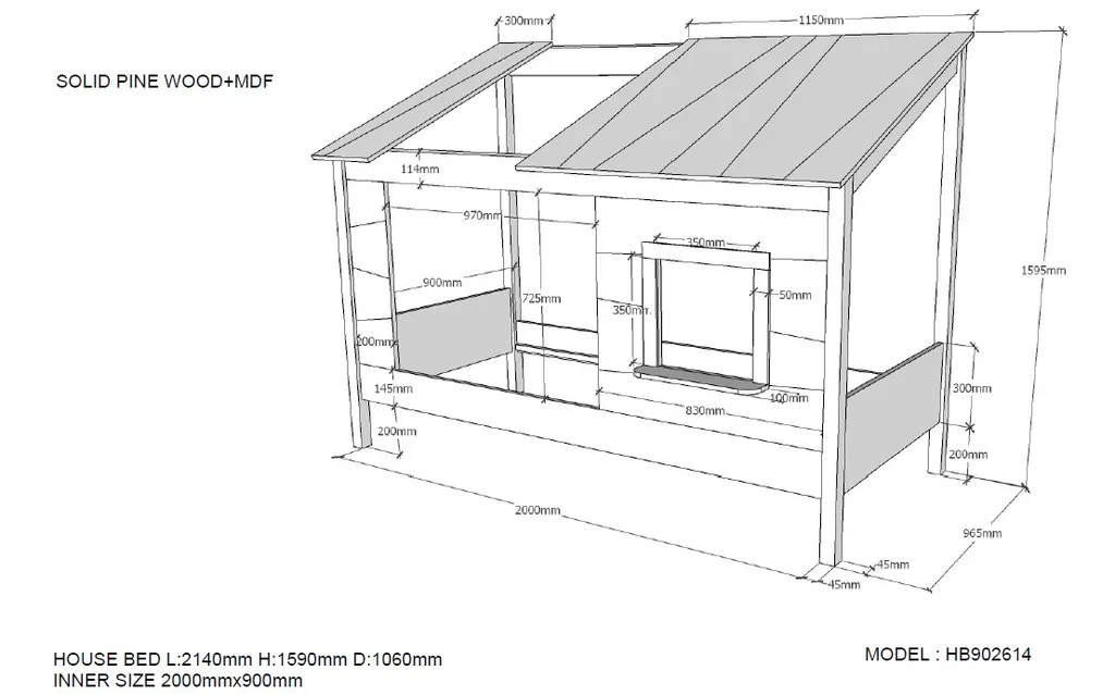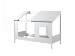 Das Bett ist einem Baumhaus nachempfunden und ein toller Platz zum Schlafen und Spielen. Die Bettschublade gehört zum Lieferumfang dazu. Das Trägermaterial ist Massivholz und hochwertiges MDF Weiß lackiert. Die durchgehenden Bettpfosten und massive Bauweise bieten eine hohe Stabiliät. Die Fräsungen in den einzelen Baugruppen sind Holzplanken nachempfunden, sie vermitteln eine Optik, wie sie bei Baumhäusern typisch ist. Die Liegefläche ist 90 x 200 cm und durch die niedrige Einstiegshöhe von cm 34,5 cm einfach zu erreichen. Der nach links versetzte Zugang zum Bett hat eine Breite von ca. 97 cm und eine lichte Höhe von ca. 71,5 cm. Rechts daneben ein Fenster mit Rahmen im Format 35 x 35 cm. Das Bett hat keinen Lattenrost im Lieferumfang und ist für einen festen Lattenrost oder Rolllattenrost geeignet. Die Einlegetiefe für Lattenrost und Matratze ist ca. 10 cm. Durch die niedrige Einstiegshöhe ist das Bett gut zu erreichen und bietet trotzdem noch eine Bodenfreiheit von ca. 20 cm. Die Oberkante von Kopf- und Fußseite ist ca. 50 cm, nach hinten ist das Bett offen. Das nach vorne abfallende Dach hat eine Maximalhöhe von ca. 158,5 cm, vorne ca. 110 cm. Das Dach ist links versetzt offen (Breite ca. 69 cm), die geschlossenen Elemente rechts und links haben schräg zulaufende Fräsungen und können auch nur in der vorgegebenen Position montiert werden. Die Bettschublade mit einem Innemaß von ca. 90 x 190 cm, ist ideal als zusätzliche Schlafgelegenheit und Stauraum für Spielsachen oder Bettwäsche. Das Material ist hochwertiges MDF weiß lackiert. Die Front der Bettschublade ist glatt. Die beiden Griffaussparungen sind ein nettes Detail und erleichtern gleichzeitig das Herausziehen und Hineinschieben der Bettschublade. Durch den Rollenauszug lässt sich die Schublade einfach bedienen. Die Innenhöhe der Bettschublade ist ca. 12 cm. Die durchgehende Bodenplatte ist Nachbildung beschichtet. Die Außenabmessung der Bettschublade ist ca.: B: 198,5 x H: 18,5 x T: 94 cm. Die Ware ist hochwertig verarbeitet und die Beschläge sind aus Metall. Stellfläche gesamt ca.: B: 214 x H: 158,5 x T: 108 cm + 94 cm bei ausgezogener Bettschublade.