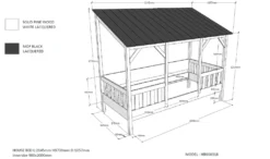 Dieses Hausbett, mit einer Liegefläche von 90 x 200 cm, ist ein toller Platz zum Schlafen und Spielen. Das Trägermaterial ist Massivholz und hochwertiges MDF in Weiß lackiert. Die Liegefläche, mit einer Einstiegshöhe von ca. 36 cm, hat an den Seiten und Vorne eine Umrandung, die 66 cm hoch ist. Ein hübsches Detail, was die Hausoptik unterschreicht, ebenso wie die Verstrebungen zum Dach hin. Dies trägt auch mit den durchgehenden Bettpfosten zu einer hohen Stabiliät bei. Das komplett geschlossene Dach hat senkrechte Fräsungen. Die Liegefäche ist durch den 68 cm breiten Eingang zu erreichen. Die lichte Höhe ist vorne ca. 87,8 cm. Durch die niedrige Einstiegshöhe ist das Bett gut zu erreichen und bietet trotzdem noch eine Bodenfreiheit von ca. 20 cm. Die Einlegetiefe für Lattenrost und Matratze ist ca. 12 cm. Das nach vorne abfallende Dach hat eine Maximalhöhe von ca. 174 cm, vorne ca. 125 cm. Die Rückseite hat ein Paneel bis zur Höhe der Umrandung, darüber ist das Bett offen. Die Ware ist hochwertig verarbeitet und die Beschläge sind aus Metall. Stellfläche ca.: B: 214,2 x H: 174 x T: 105,3cm.