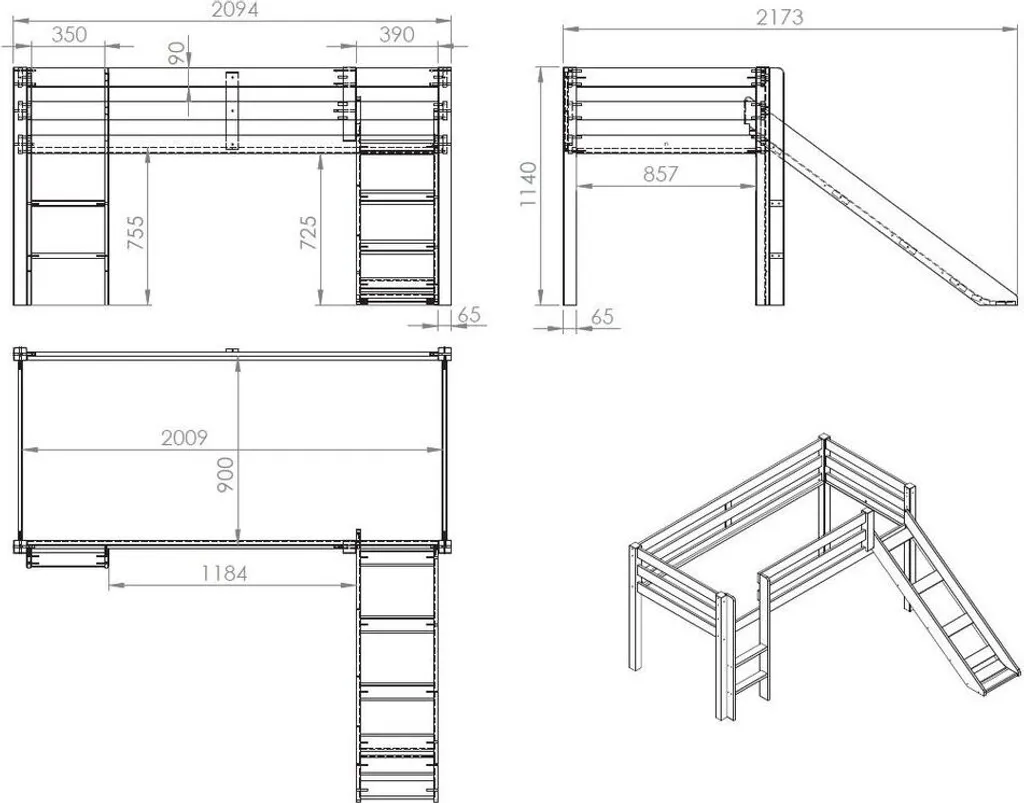 Der Raum unter der Liegefläche lässt sich prima zum spielen nutzen, oder kann als Stauraum genutzt werden. Die Höhe vom Boden bis Unterkante der Bettseite beträgt ca. 70 cm. Ein Rolllattenrost gehört zum Lieferumfang. Die Leiter ist links oder rechts montierbar. Der umlaufende Absturzschutz, die breiten Trittstufen zum sicheren Hinauf- und Hinabsteigen, sowie die hochwertige Verarbeitung und gute Stabilität, zeichnen diesen Artikel aus. Pfostenstärke ca. 6,5 x 6,5 cm. Die Liegefläche ist 90 x 200 cm. Benötigte Stellfläche ca. 210 x 218 cm. Höhe 114 cm + ca. 100 cm für den Tunnel.