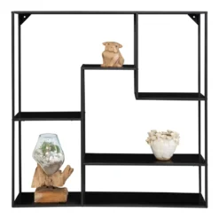 Das Regal besteht aus fünf unregelmäßigen Regalen in verschiedenen Größen. Der Rahmen ist aus schwarzem Stahl gefertigt und die Regale sind aus schwarzer melaminbeschichteter Spanplatte gefertigt.