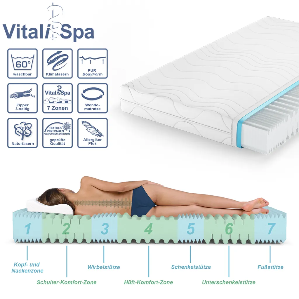 VitaliSpa® Calma Comfort Plus 7 Zonen Marken Kaltschaum Matratze Höhe:20cm, BreitexLänge:120x200cm, Obermaterial 100% Polyester. Härtegrad 2 = mittel, bis 80 kg Körpergewicht.