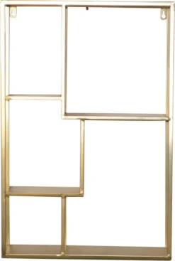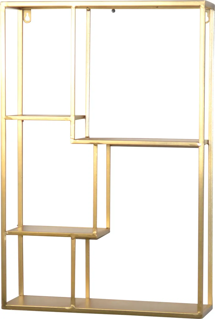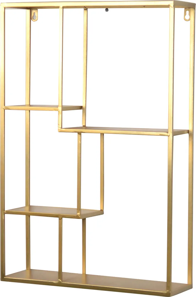 Dieses Regal ist komplett aus Metall, daher stabil. Es ist goldfarben pulverbeschichtet, aber auch in einer anderen Farbe bei uns erhältlich. Es bietet unterschiedliche Abteilungen mit insgesamt 4 Regalböden. Hier ist Dekorieren und Einsortieren eine schöne Möglichkeit geschmackvoll Dinge in den Blickpunkt zu stellen. Das Regal ist ein tolles Wandobjekt, sorgt für Auflockerung und Wohnlichkeit.