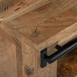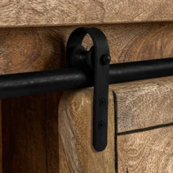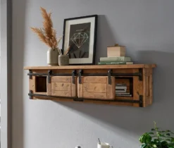Nicht nur lassen sich auf dem Wandregal aus Massivholz die unterschiedlichsten Dekorationsartikel platzieren, die dem Raum zusätzlich Leben einhauchen, sondern es lassen sich auch Kleinigkeiten in den insgesamt drei offenen Fächern verstauen, die von gleich zwei eleganten Schiebetüren auf Eisenleisten verschlossen werden können.